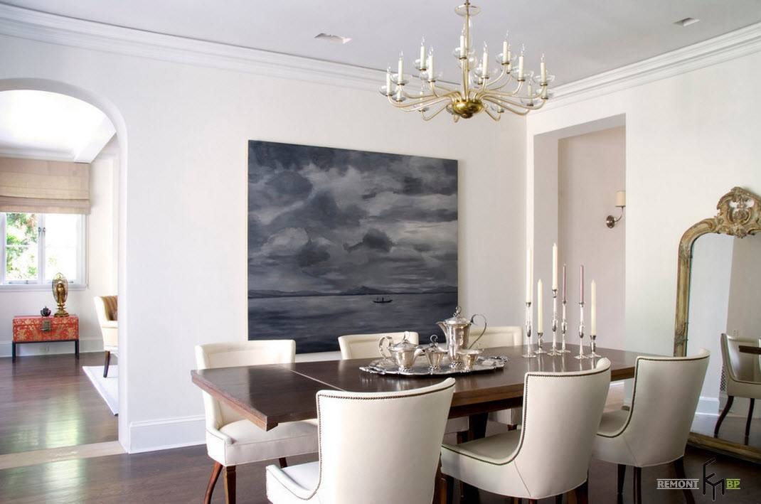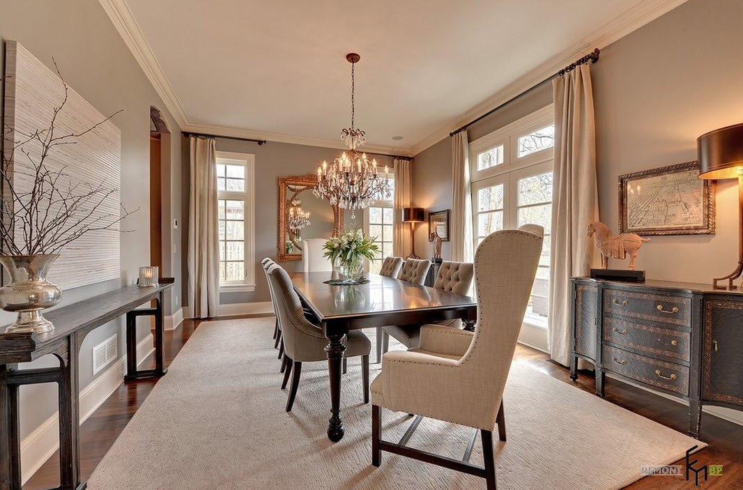 Контрастный интерьер классической столовой предполагает гармоничное сочетание оттенков темных пород древесины и мягкой, нейтральной палитры мебельной обивки, текстиля и отделки помещения. Присутствие в интерьере блестящих, зеркальных поверхностей добавляет обстановке гламура и очарования роскоши.