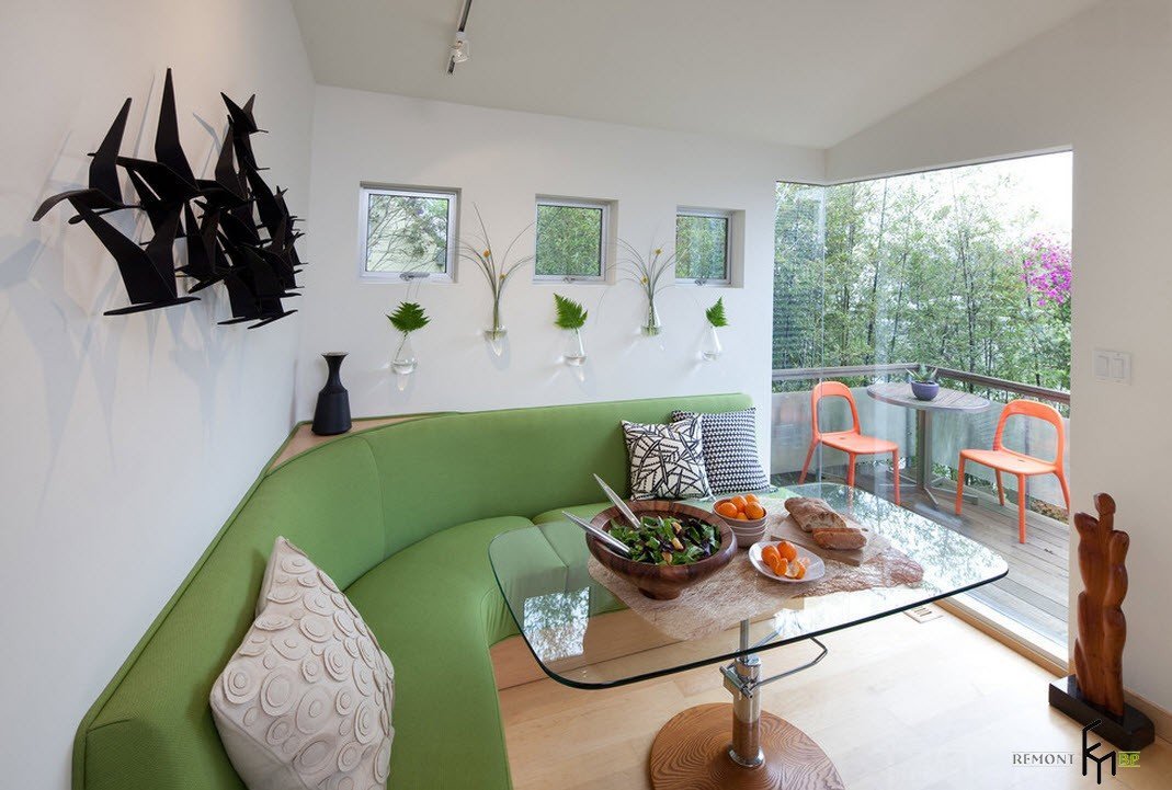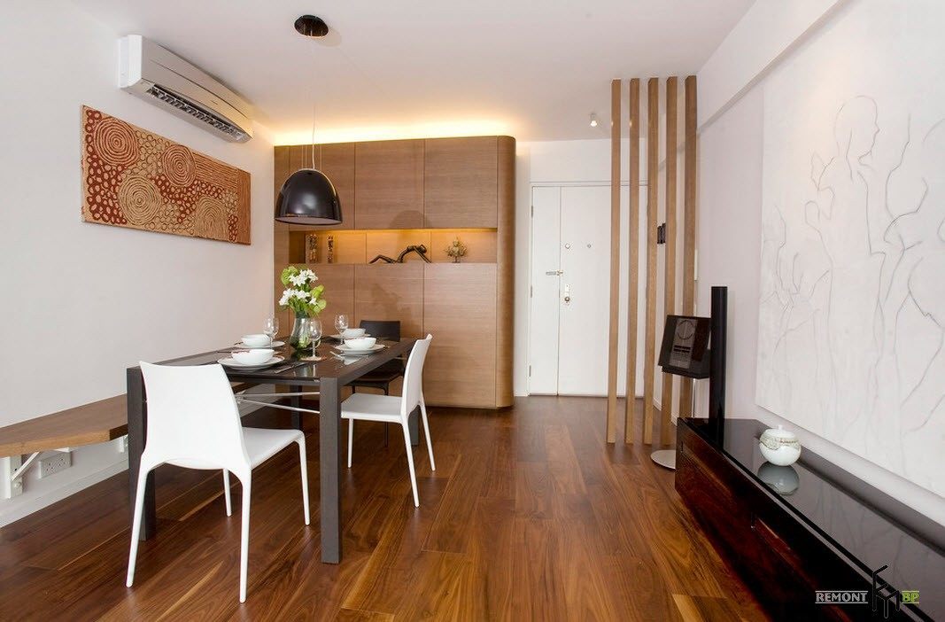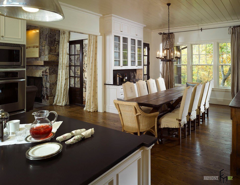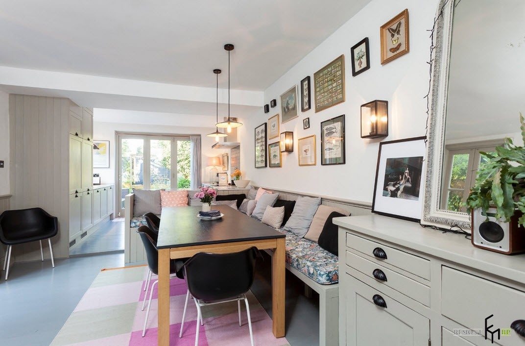 Планируя создание столовой, важно учесть возможность двух выходов из комнаты – в помещение кухни и гостиной или общего коридора, на лестницу. Если между пространством рабочей зоны кухни и столовой есть 1,5-2 м, то это расстояние можно считать благоприятным для комфортного нахождения в обеих зонах.