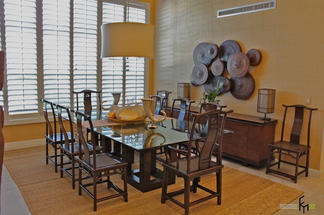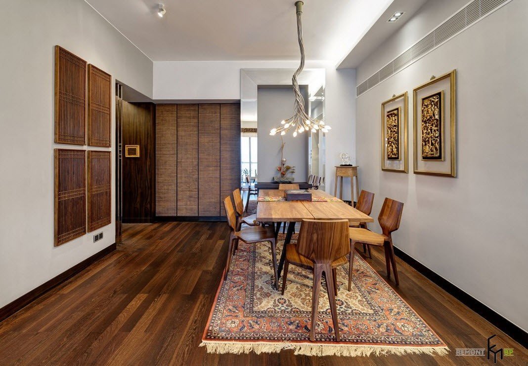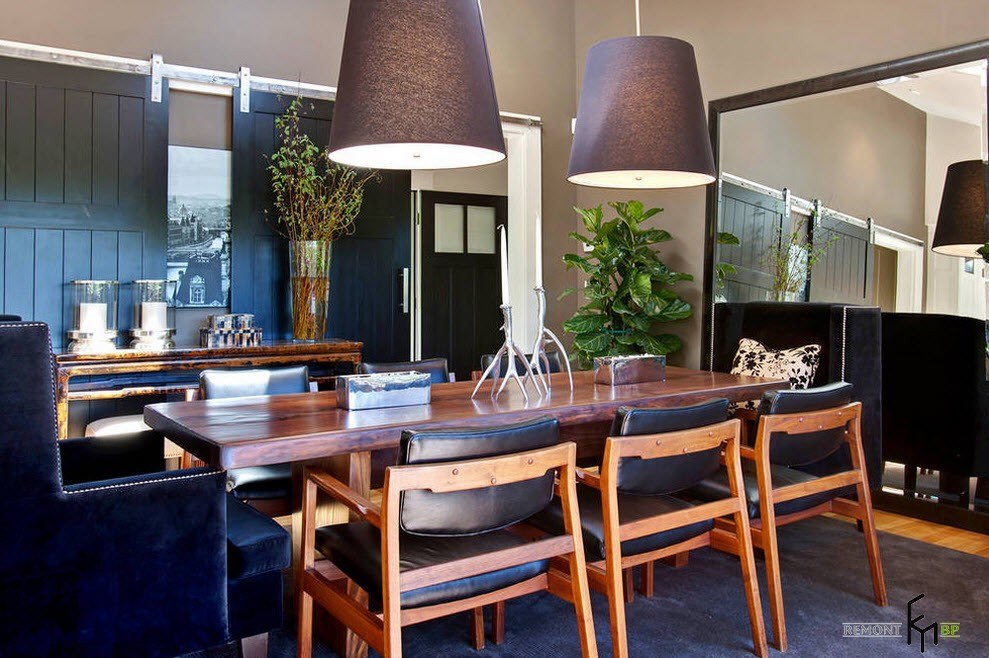 Оригинальная обеденная группа из темной древесины с зеркальной столешницей просторного стола, безусловно, достойна того, чтобы быть центром притяжения всеобщего внимания. Вся дополнительная меблировка комнаты выполнена из того же натурального материала, что и обеденный ансамбль и образует гармоничный интерьер с нетривиальным внешним видом и приятной, теплой атмосферой.
