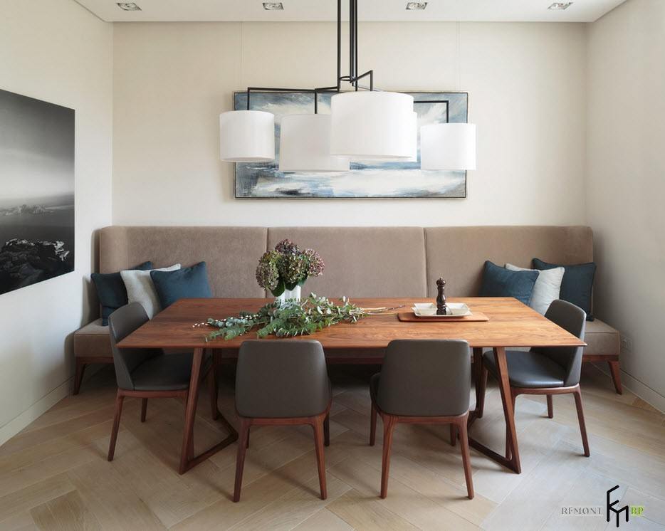 Для оформления интерьера столовой или гостиной с обеденной зоной дизайнеры часто прибегают к использованию стиля модерн или его комбинации с другими стилистическими течениями. Любовь модерн-стилистики к дорогим, натуральным материалам, плавность форм и линий, стремление к декорированию, но не чрезмерному, отражается и в выборе модели обеденной группы
