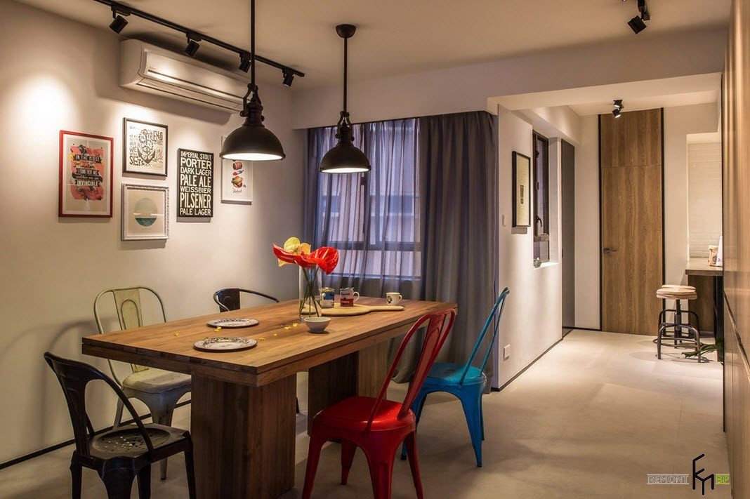 Простой, но внушительный деревянный стол выглядит оригинально в кампании с разноцветными стульями. Нетривиальности интерьеру столовой добавляют арт-объекты на стенах и оригинальная система освещения.