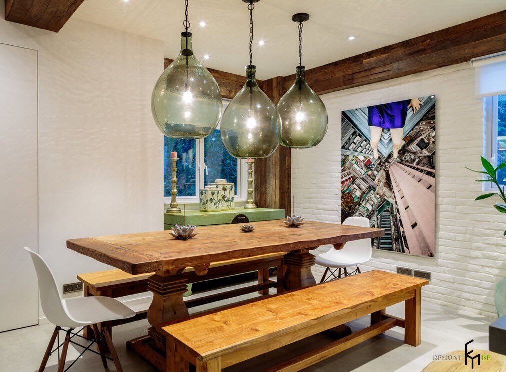 А в этой эклектичной столовой деревянный стол с лавками и стульями дизайнеров Эймс стали основой концепции совмещения природных материалов с современными предметами быта и способами отделки помещений.