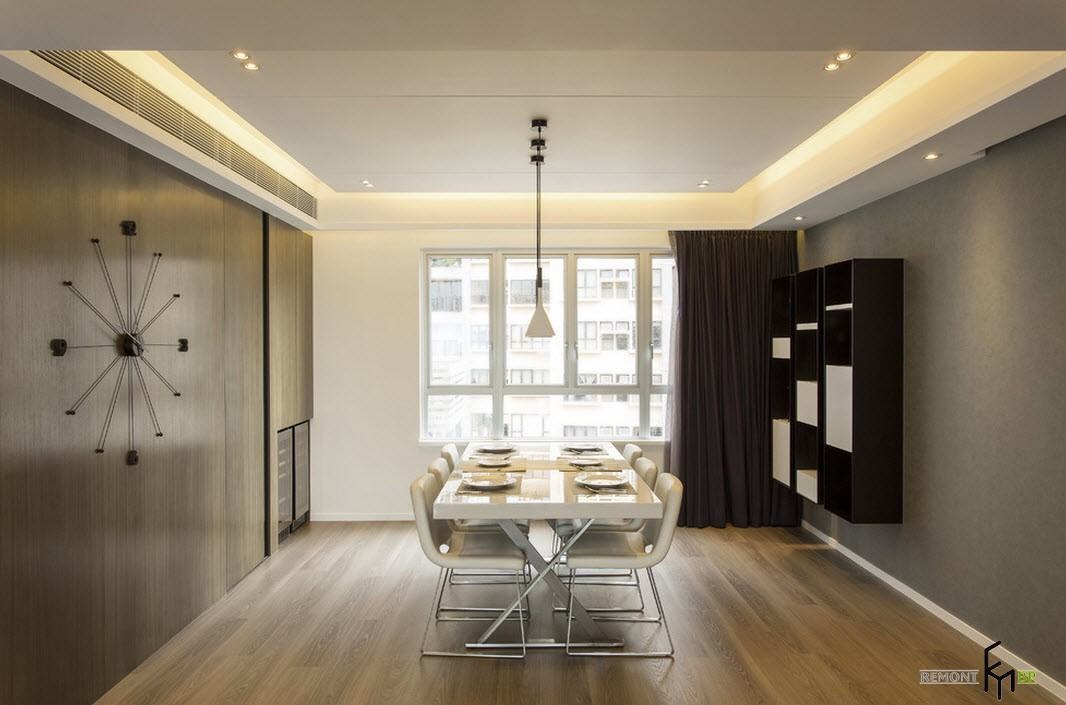 Эта обеденная зона в теплых приятных тонах природного происхождения несет и еще одну функциональную нагрузку – зала для дегустации вина. Вся необходимая атрибутика, включая винный холодильник, расположена в шкафу, который является ширмой для соседнего помещения.