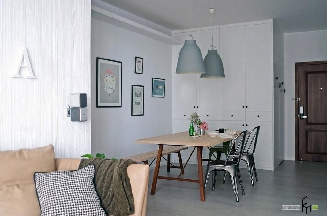 При расположении обеденного стола не в центре комнаты, а у стены важно помнить о необходимом расстоянии от стола до поверхности стен или дверей – не мене полуметра.