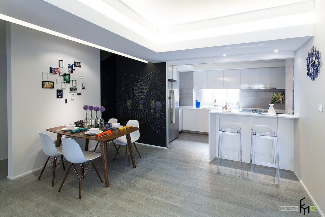 Вот та самая простота, практичность и тяга к просторным помещениям, которой наделен минимализм как ни один другой стиль в интерьере. Обеденный стол невероятно простой конструкции, совместно с пластиковыми стульями и сидением, встроенным в нишу, образовали строгую и лаконичную обеденную группу.