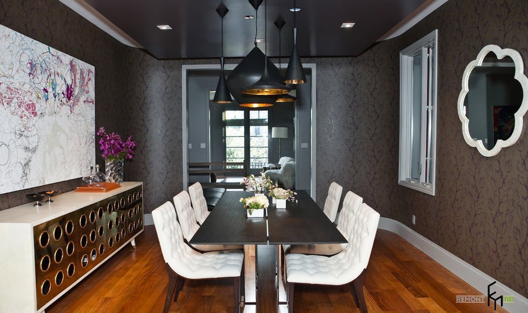 Нечасто можно встретить такой монохромный интерьер столовой с черными обоями. Дело в том, что невероятно красивый резной обеденный стол буквально требует достойного окружения – деревянных стульев с витиеватой резьбой и контрастной обивкой, черно-белой отделки помещения и расцветки коврового покрытия, и, конечно, роскошных люстр и предметов декора с множеством блестящих элементов.