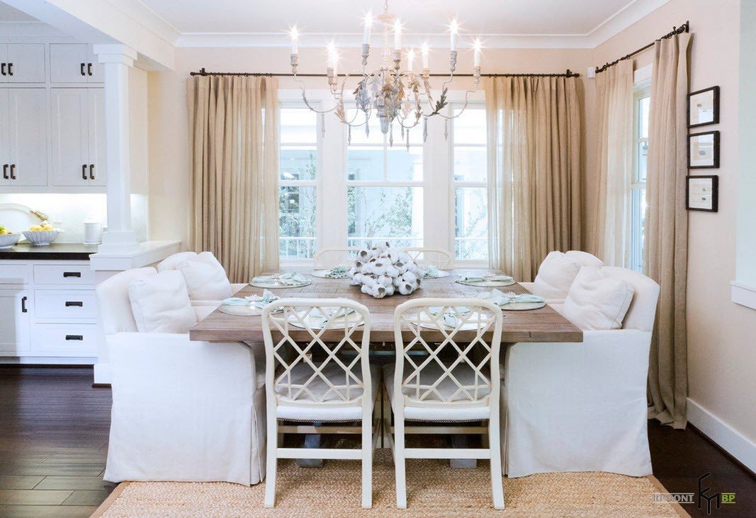 Столовая, размещенная в пространстве эркера, с круглым столом и деревянными стульями в тон, выполнена в стиле Прованс с природной цветовой гаммой в бежевых тонах.