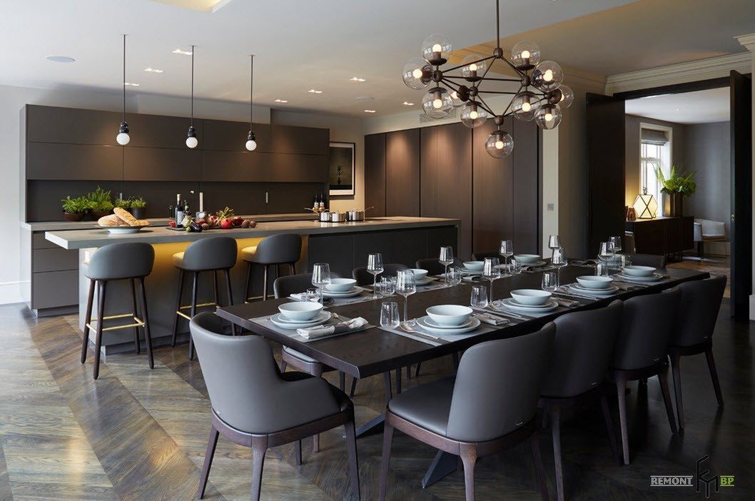Простой по конструкции и исполнению обеденный стол, меж тем, способен разместить десять человек, которые будут сидеть в удобных стульях-креслах, занимающих немало пространства каждое. Темно-серая палитра обеденной группы имеет цветовое сочетание с зоной кухни, и все помещение выглядит весьма органично и сбалансировано.
