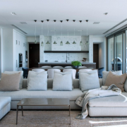 Зеркальный стол в форме восьмигранника – не единственный уникальный предмет мебели или декора в этой эклектичной гостиной. Природные оттенки и мотивы в отделке помещения и выборе предметов декора создали невероятно персонализированный, уникальный интерьер, в котором роскошь и богатство встречаются с практичностью и комфортом.
