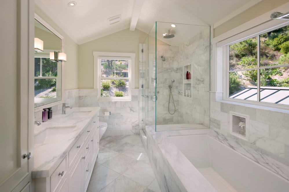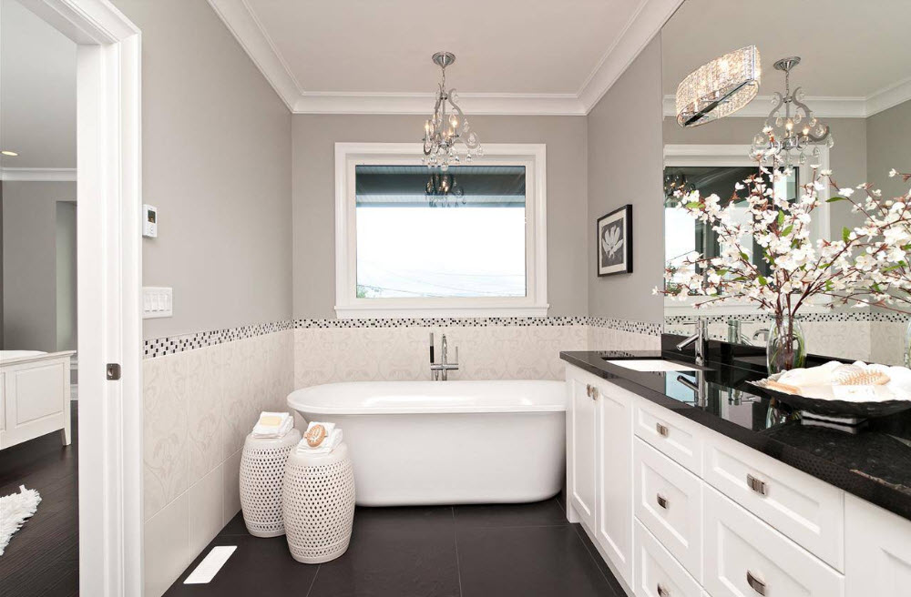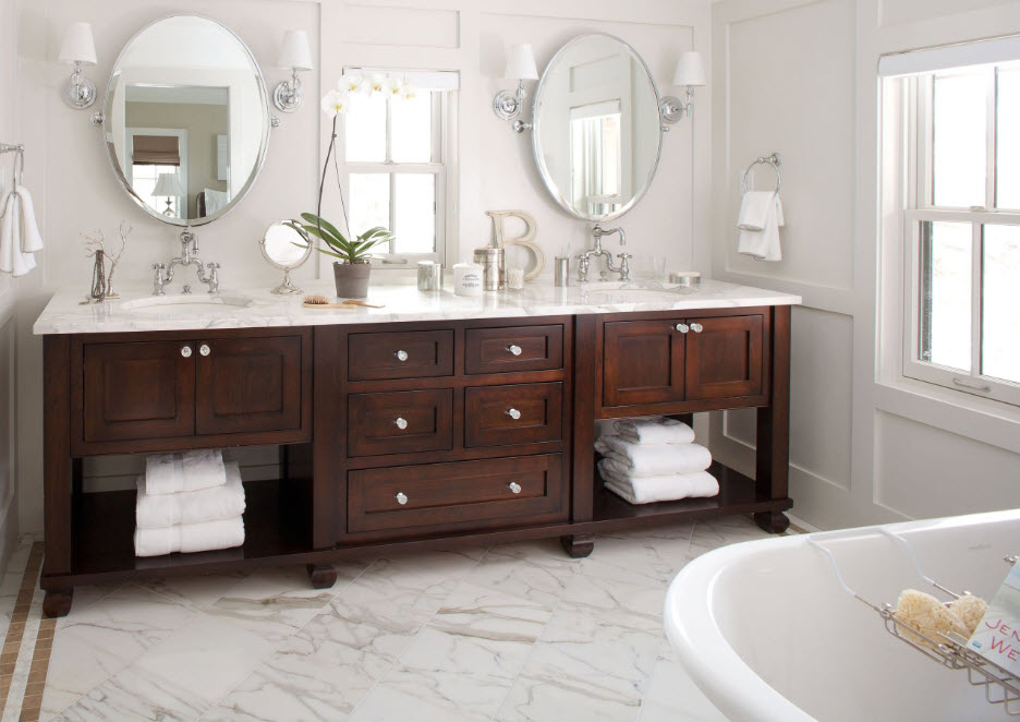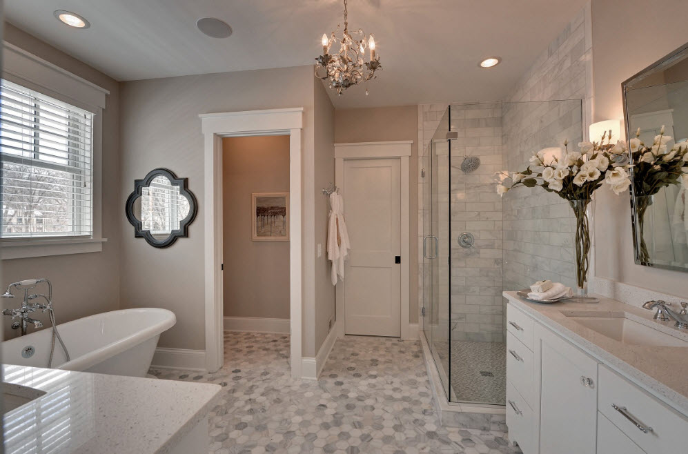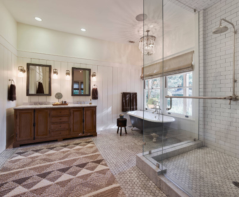 В более просторных помещениях можно использовать классические мотивы для оформления совмещенного санузла. Имитация мраморных поверхностей в отделке и исполнении столешниц, натуральное дерево на фасадах систем хранения, сантехника с ретро-элементами (ванна на гнутых ножках, смесители с крестообразными вентилями, изготовленные «под бронзу», с патиной) и даже роскошная люстра в качестве центрального осветительного прибора – в такой ванной комнате несложно будет почувствовать себя особой королевских кровей.