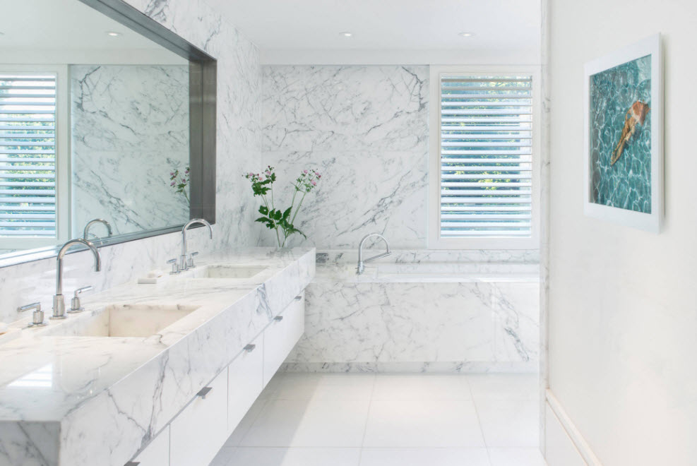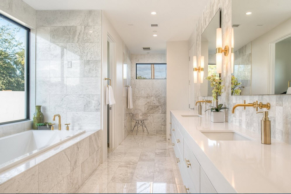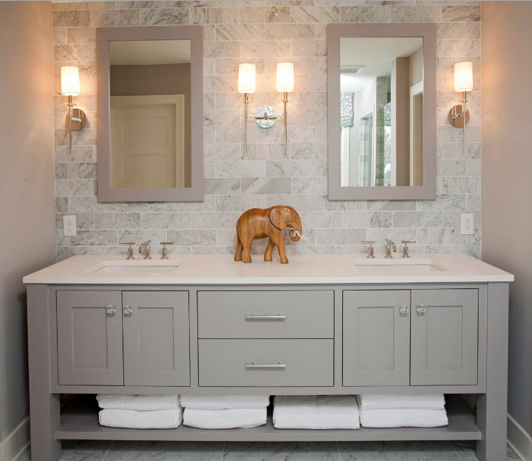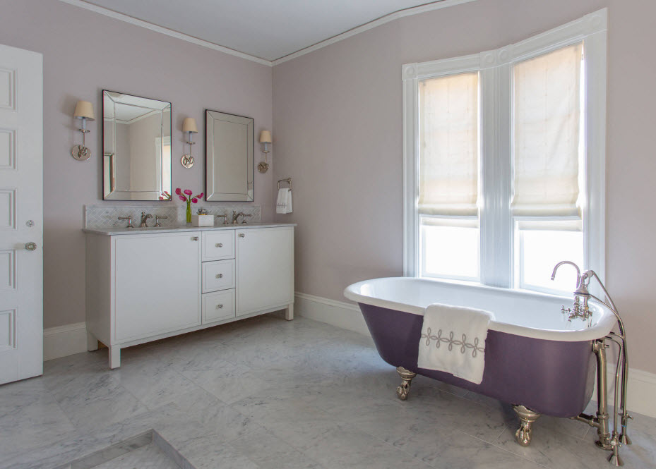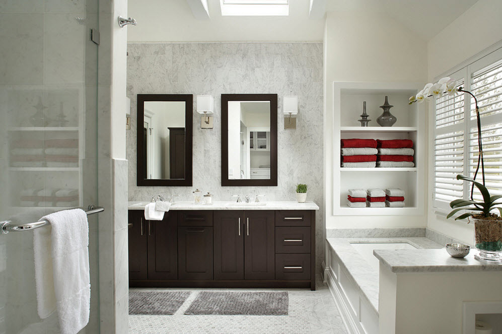 В более просторных помещениях можно использовать классические мотивы для оформления совмещенного санузла. Имитация мраморных поверхностей в отделке и исполнении столешниц, натуральное дерево на фасадах систем хранения, сантехника с ретро-элементами (ванна на гнутых ножках, смесители с крестообразными вентилями, изготовленные «под бронзу», с патиной) и даже роскошная люстра в качестве центрального осветительного прибора – в такой ванной комнате несложно будет почувствовать себя особой королевских кровей.