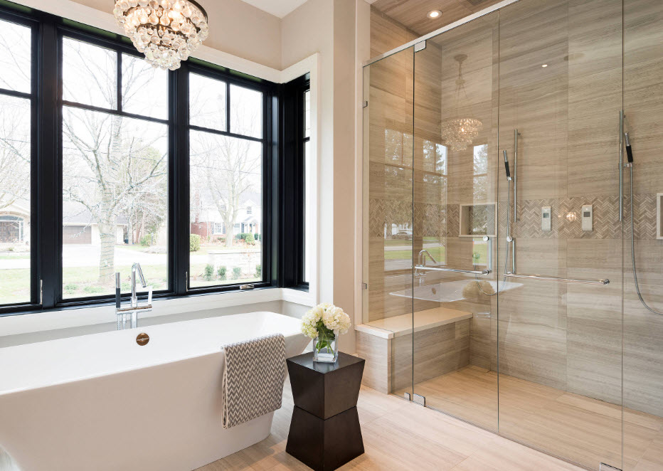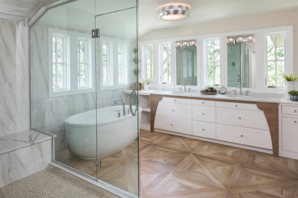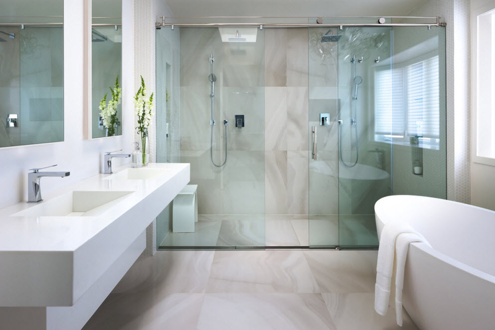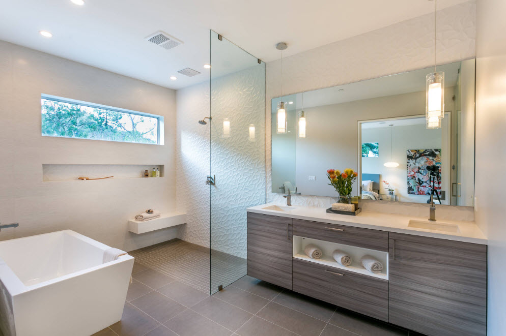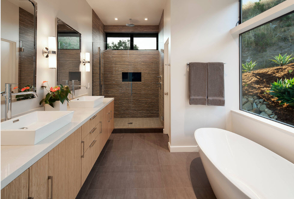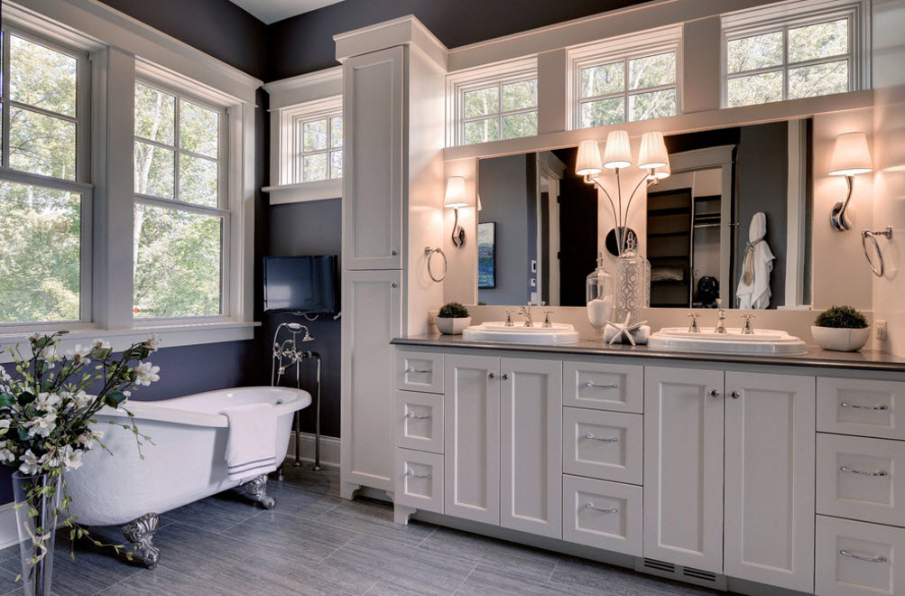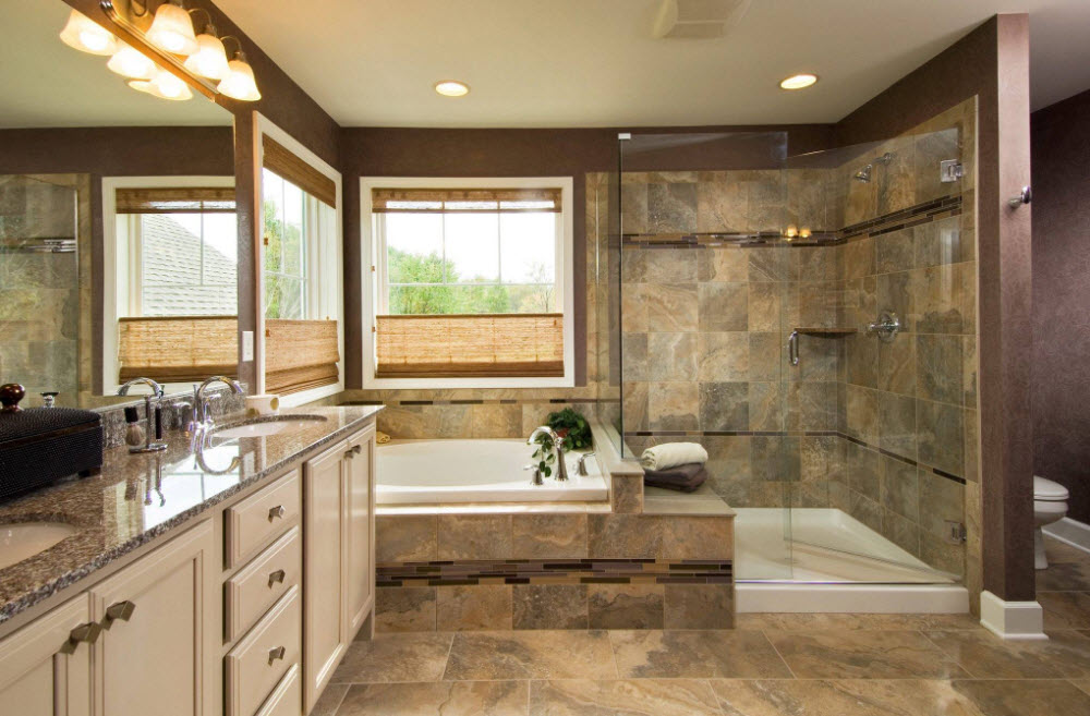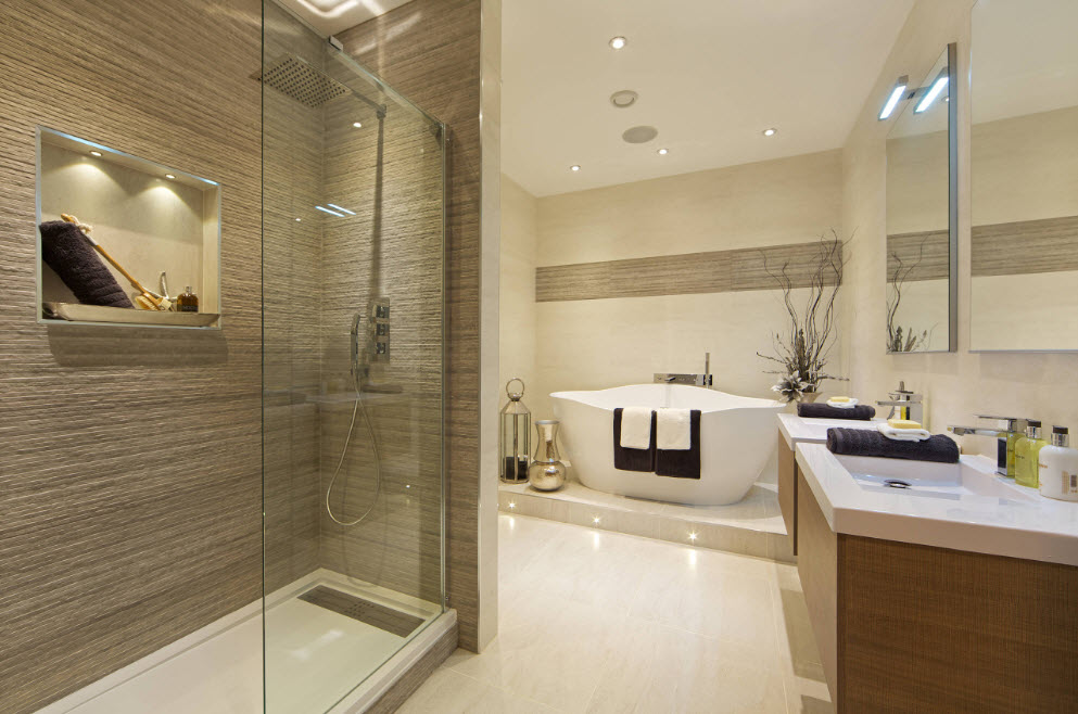 Если площадь вашего утилитарного пространства больше 8 квадратных метров, то даже установка ванны в центе помещения не станет помехой для организации комфортной и эргономичной обстановки. В больших помещениях можно установить биде или заменить стандартную ванну вместительной джакузи или разместить в современном интерьере двойную душевую кабину с парилкой.