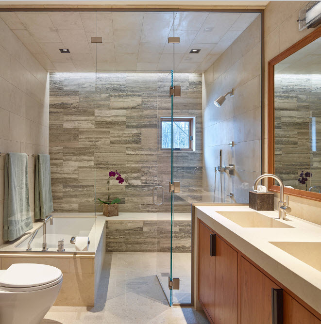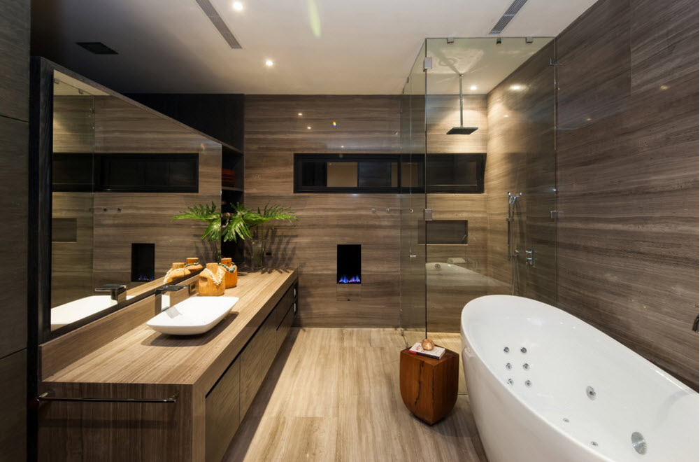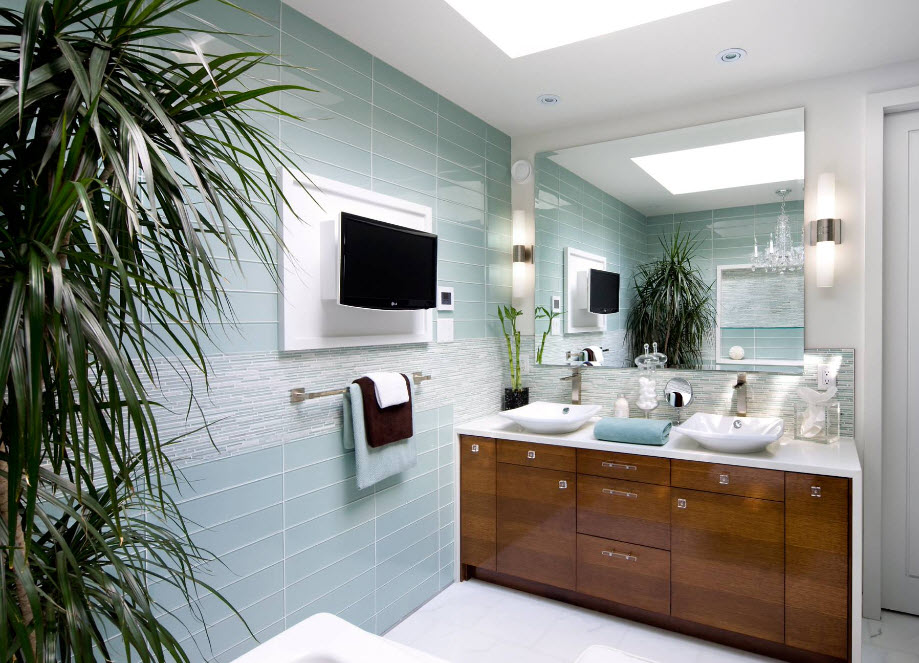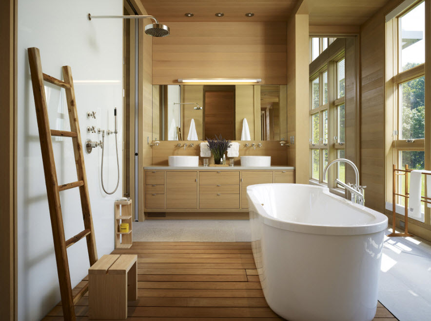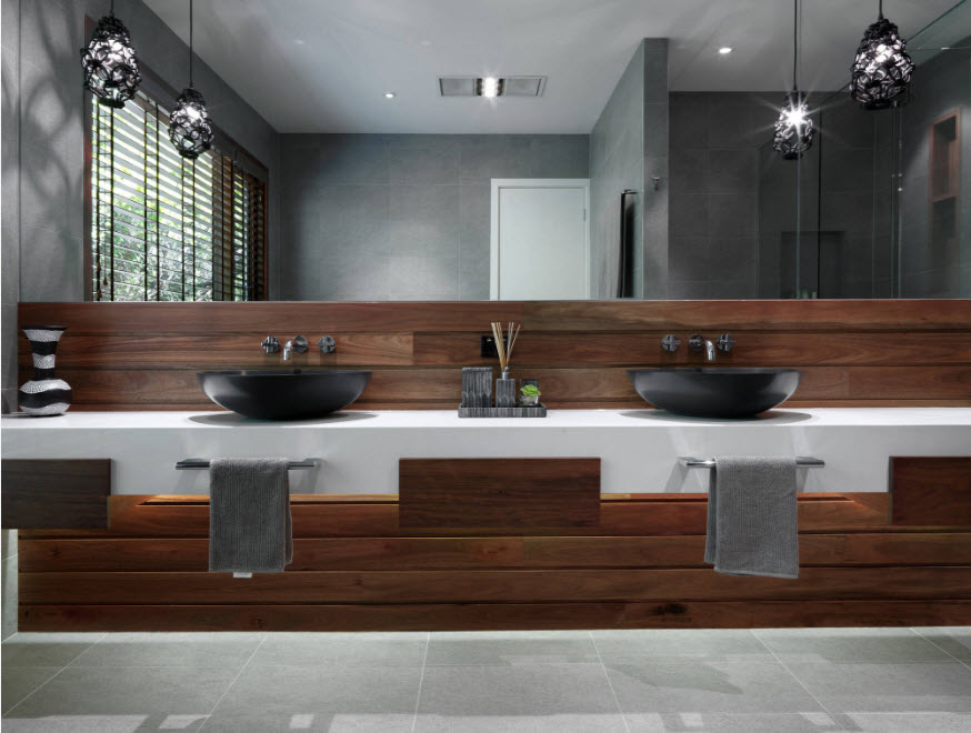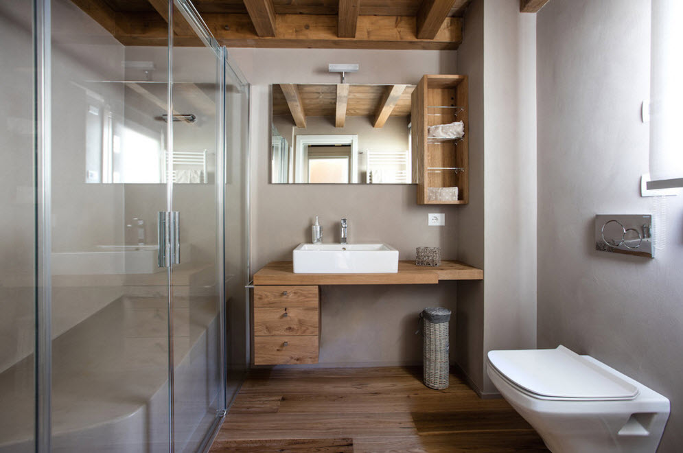 Тяготение современной стилистики к использованию эко-материалов позволяет многим дизайнерам предлагать своим заказчикам использование дерева в качестве материала отделки и исполнения систем хранения. Чаще всего дерево не применяют в качестве солирующего материала при облицовке совмещенных санузлов, комбинируя его с другими, более практичными вариантами облицовки.