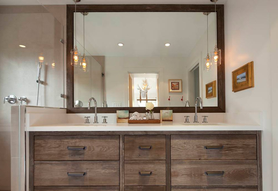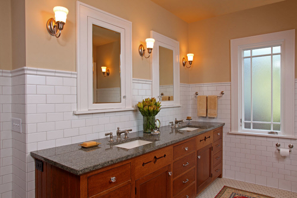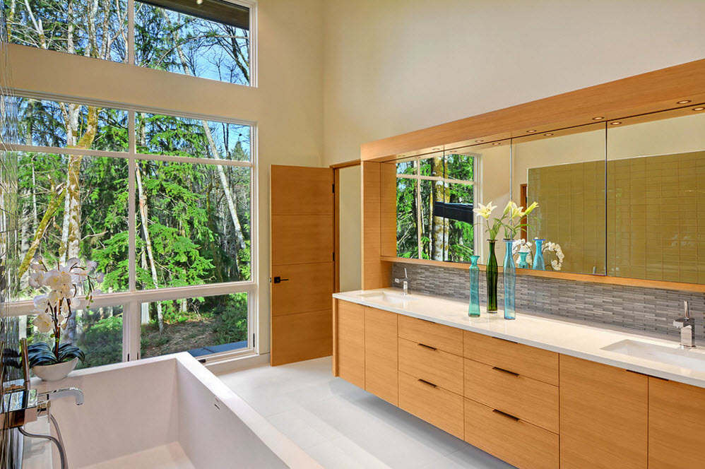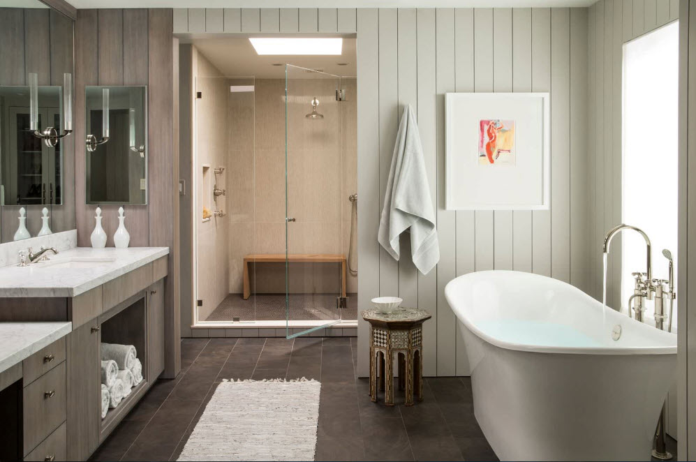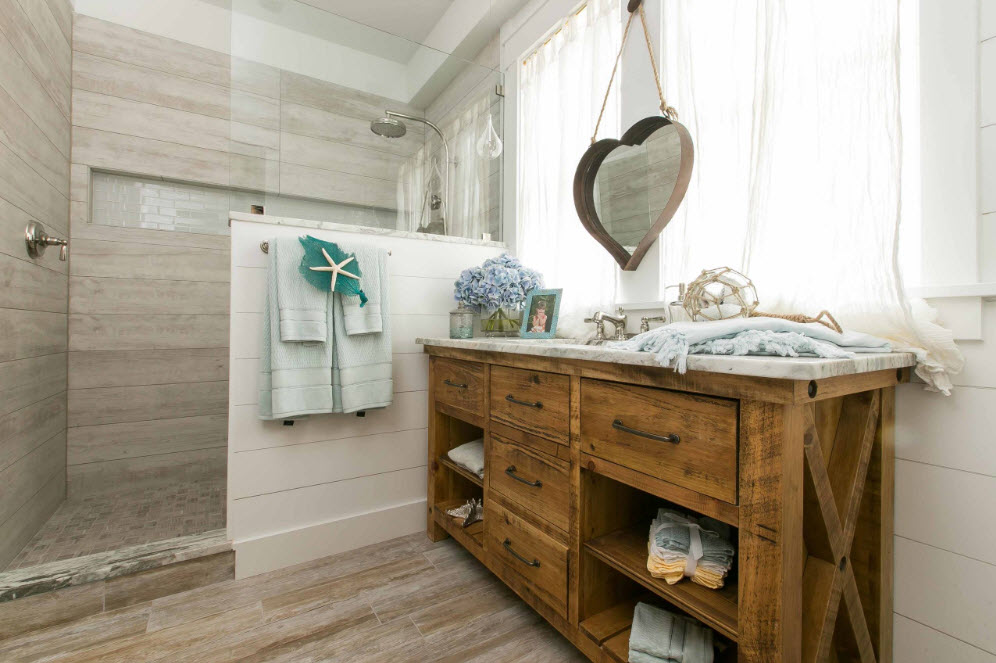 Тяготение современной стилистики к использованию эко-материалов позволяет многим дизайнерам предлагать своим заказчикам использование дерева в качестве материала отделки и исполнения систем хранения. Чаще всего дерево не применяют в качестве солирующего материала при облицовке совмещенных санузлов, комбинируя его с другими, более практичными вариантами облицовки.