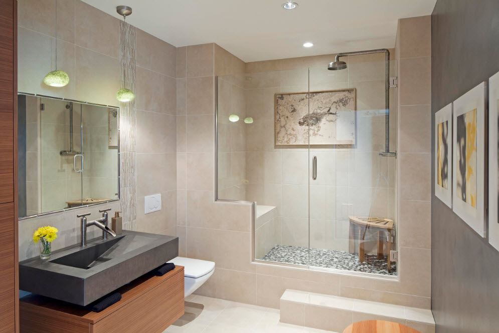 Если совмещенный санузел представляет собой скромное по размерам помещение, то лучшего выбора, нежели современный стиль, для оформления не придумать. Стремление к максимально функциональному использованию всех предметов интерьера и минимальному применению декоративных элементов, позволит не только не загромождать небольшое пространство, но и сохранить ощущение свободы и простора. Современный стиль с его четкими формами и строгими линиями, практичностью и рациональностью отлично будет смотреться с нейтральным выбором цветовой палитры, эффектно подчеркнутой контрастными элементами, одним-двумя акцентами.