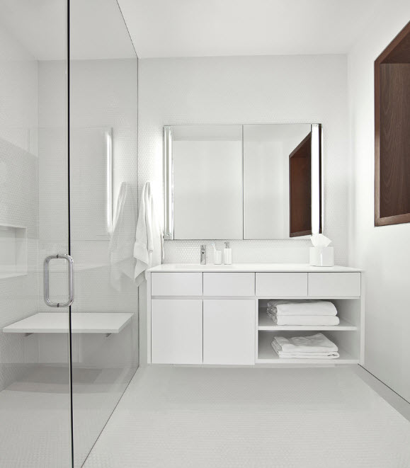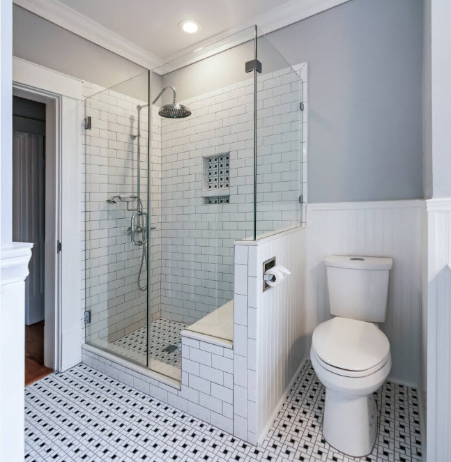 Для небольших помещений с совмещенной планировкой рекомендовано использовать для отделки стен керамику светлых тонов с глянцевыми поверхностями. И светлая цветовая палитра, и глянец, способствуют визуальному увеличению пространства. Единственное, что необходимо учесть – глянцевые поверхности нельзя очищать абразивными средствами, на них видны даже микроцарапины. Если же глянцевая плитка будет темного цвета, то следы от мыльной пены и даже капель чистой воды на ней будет гораздо сильнее заметна, нежели на матовой облицовке.
