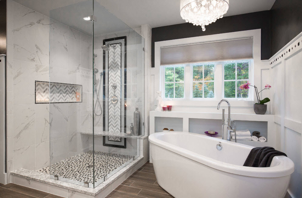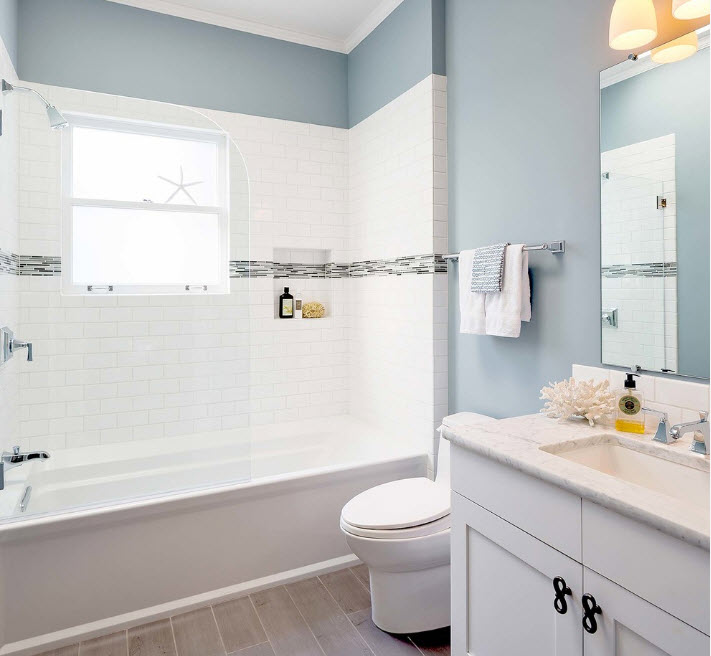 В совмещенном санузле с помощью отделки можно выделять функциональные зоны. Различная текстура, контрастные сочетания цветов, использование декора (бордюров, вставок и плинтусов) – все это поможет зонировать помещение, не нарушая свободной планировки пространства.