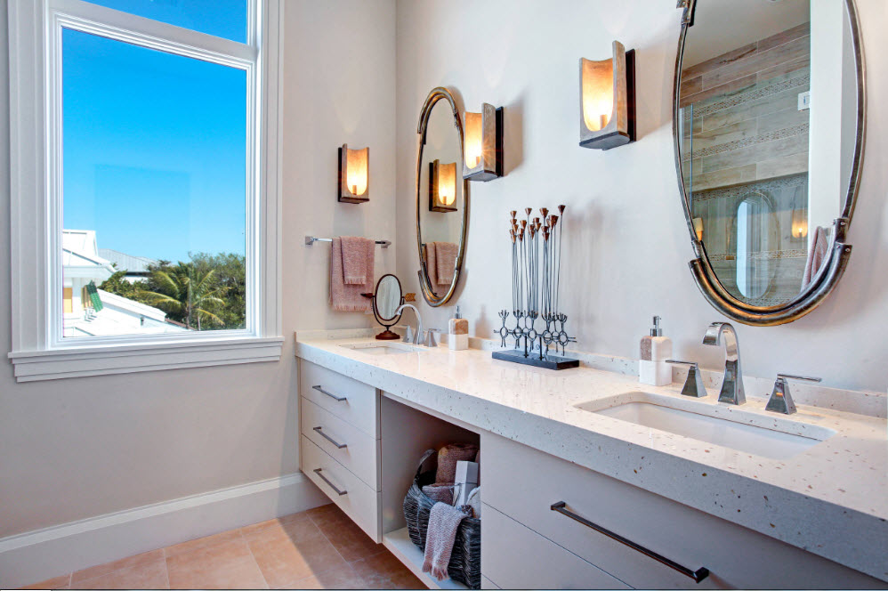 В просторном помещении совмещенного санузла можно не ограничиваться установкой стандартного набора сантехники. Удобным и практичным подходом к организации комфортабельной обстановки для водных процедур является установка двойной раковины – экономия времени по утрам с лихвой окупит затраты на покупку и монтаж второго умывальника.