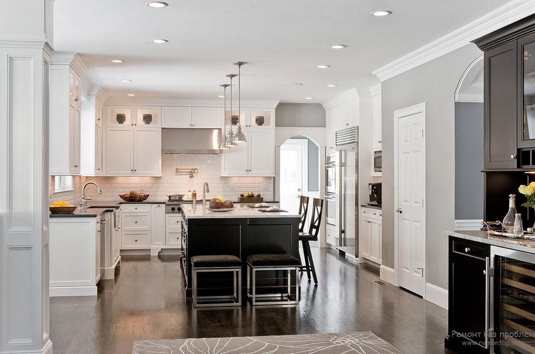 - если вы любитель посидеть с друзьями за барной стойкой с чашечкой бразильского кофе Сантос или бокалом немецкого пива Doppelbock, то в этом случае можно выполнить зонирование большой кухни с помощью этой самой стойки. Приятный и полезный вариант.