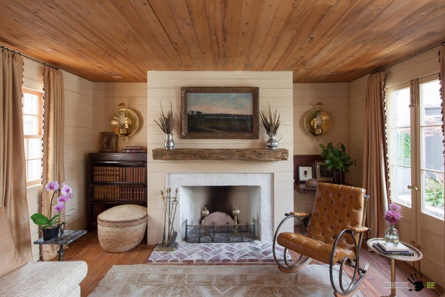 Использование различных способов и техник для отделки поверхностей в помещении гостиной, позволяет создать неповторимый и уникальный интерьер комнаты – неокрашенное и покрытое краской дерево, кирпичные и оштукатуренные стены, нарочито состаренные поверхности – обилие способов отделки не режет глаз, потому что все они выполнены в одном спектре цветовых решений и близки друг к другу фактурно и качественно.