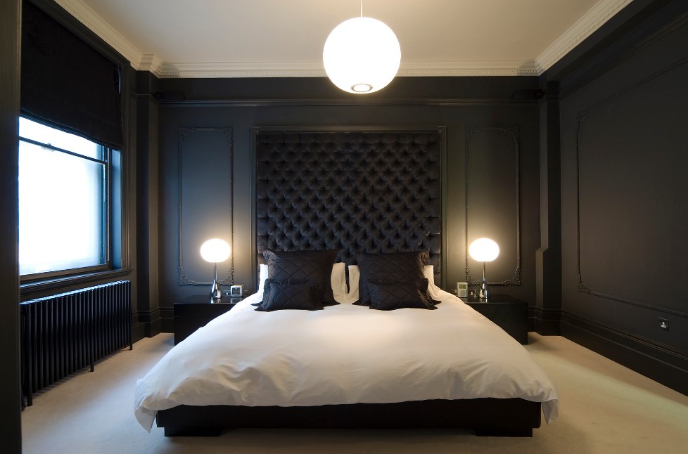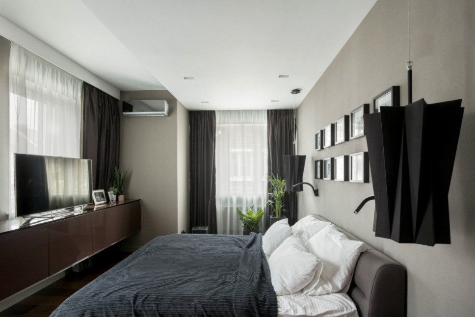 Что касается мебели для такой спальни, то здесь допустимы хромированные, лакированные предметы мебели, прямые и лаконичные линии, минимальное количество аксессуаров и декор-элементов.