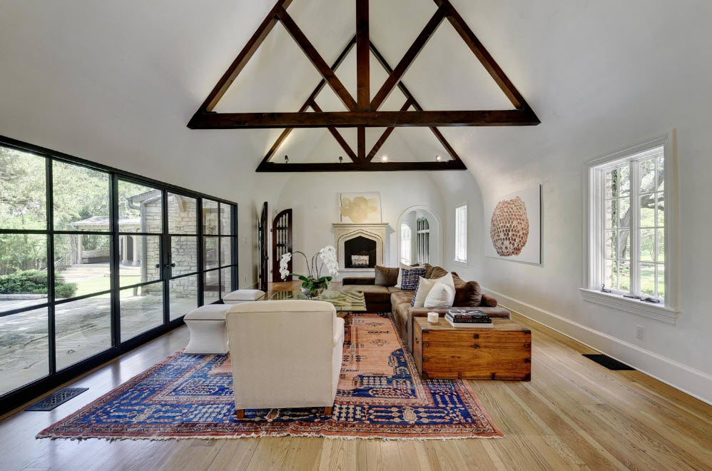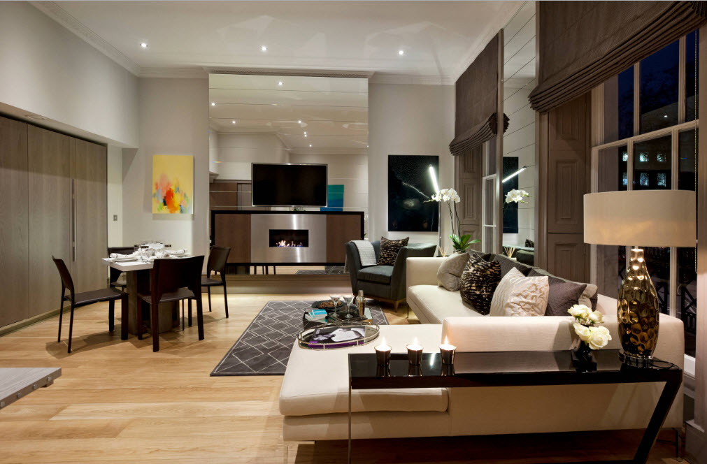Если ваше помещение, которое впоследствии станет гостиной, имеет большие размеры, высокие окна, наполняющие комнату солнечным светом, то проблем с осуществлением задуманного современного дизайна не будет. Но просторные помещения – удел частных домов или квартир улучшенной планировки. Для стандартных жилищ времен постройки прошлого столетия выходом может стать только расширение за счет других помещений. Совмещение лоджии или коридора с комнатой, увеличение дверных и оконных проемов (если это возможно) позволит создать иллюзию простора даже в небольшом помещении.