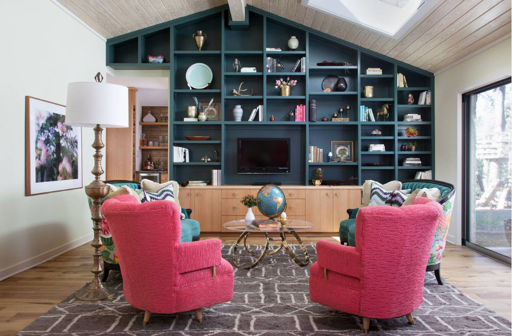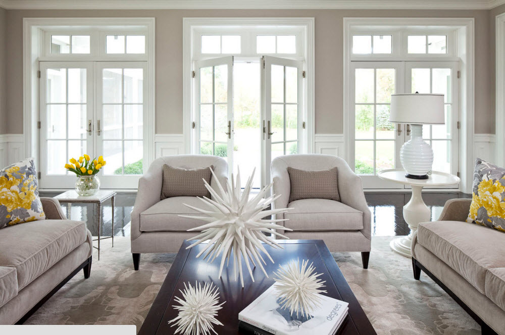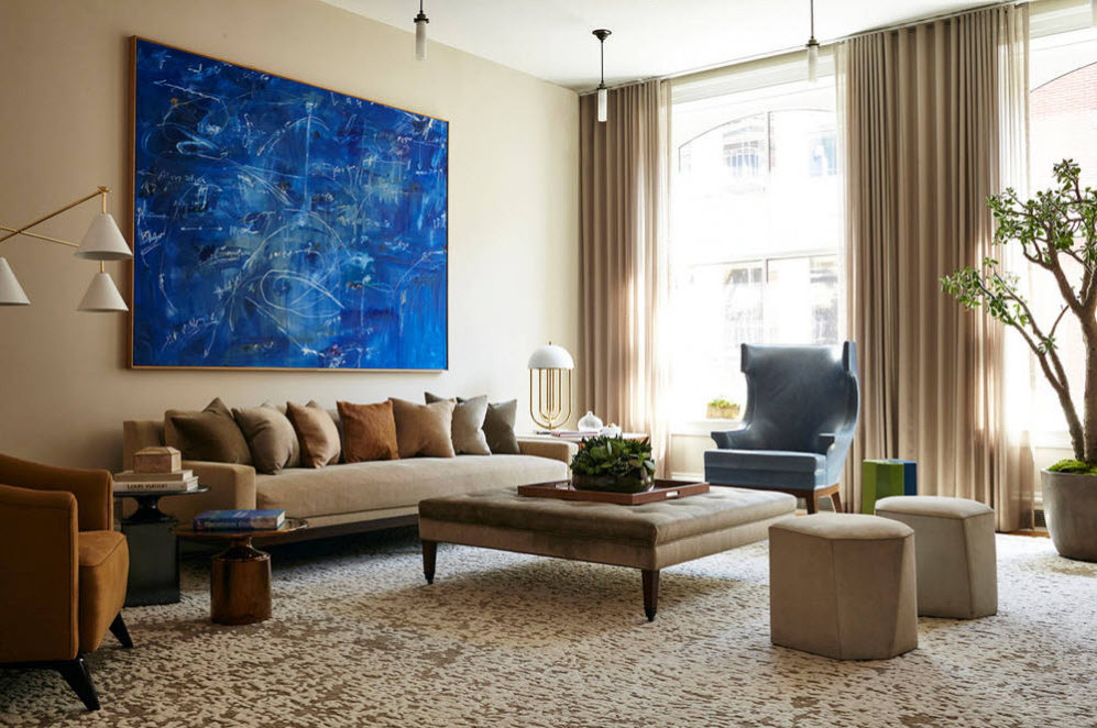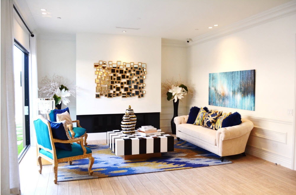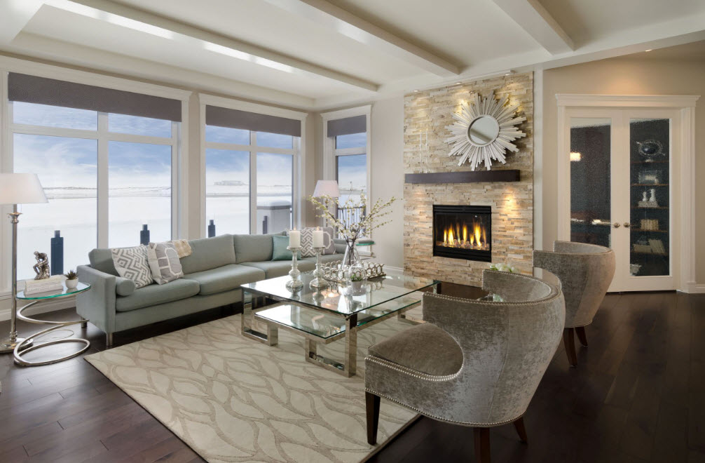 Гостиная, созданная в современной концепции оформления – это нейтральный интерьер с акцентом. На фоне всех оттенков серого или бежевого цвета (часто даже белоснежного дизайна) присутствует один или два ярких предмета. Это может быть большой диван с колоритной однотонной обивкой или необычное панно на стене больших размеров. В Качестве акцента может выступать ковровое покрытие или большое растение в горшке ручной работы, привезенном хозяевами из увлекательной поездки. Преимущество такого подхода в формировании интерьера в том, что вам будет легко изменить настроение комнаты. Заменили декоративные диванные подушки, повесили другую картину на главную стену или выбрали иной цвет для колоритных штор – новый образ гостиной готов.
