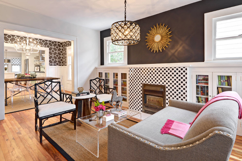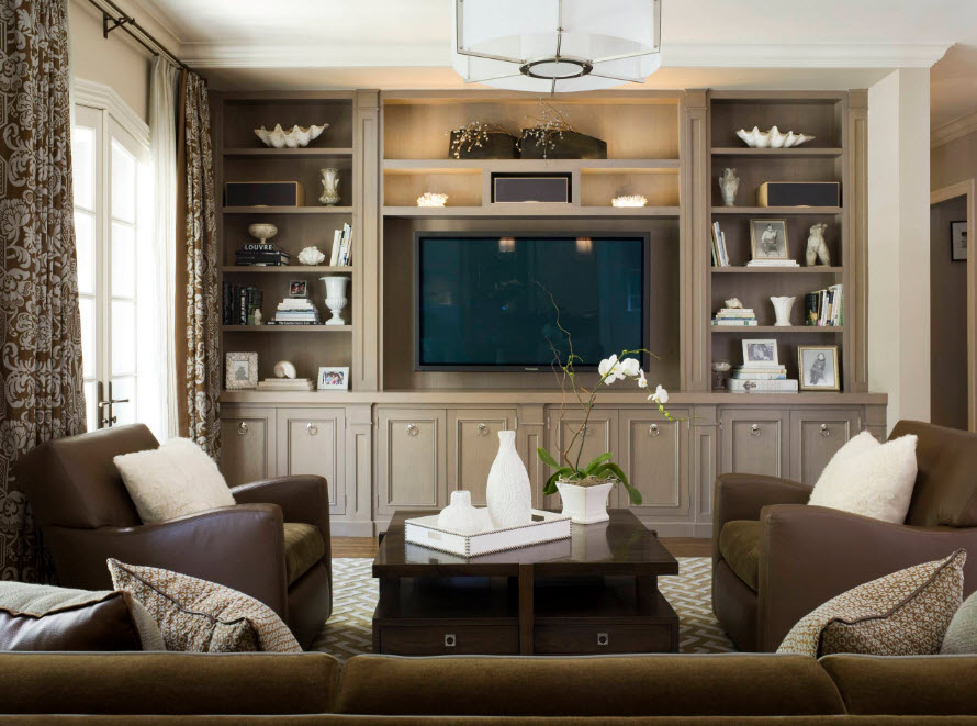 Не меньшего внимания заслуживает и система искусственного освещения. Даже в небольшой гостиной недостаточно одной центральной люстры. В зависимости от размеров помещения, количества функциональных сегментов, а в гостиной часто располагается рабочее место, уголок для чтения или пара кресел для приватных бесед, можно использовать несколько локальных источников света. Очевидно, что все приборы освещения должны быть выполнены в схожем дизайне, являться пазлами в гармоничной картине интерьера. Современный дизайн гостиной не табуирует вариации световых приборов – от подвесной люстры и встроенных в конструкцию потолка или мебели светильников до напольных торшеров и настенных бра.