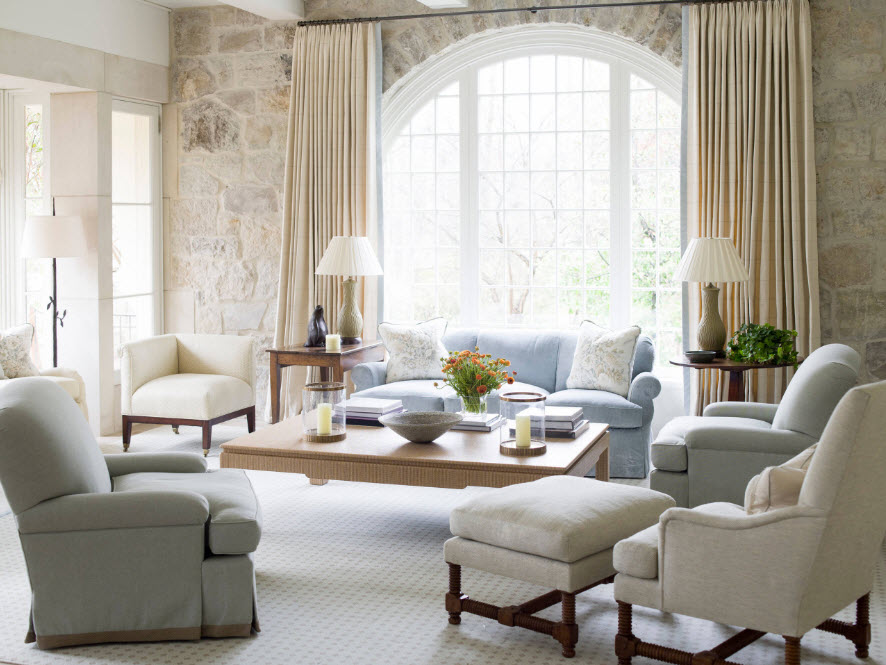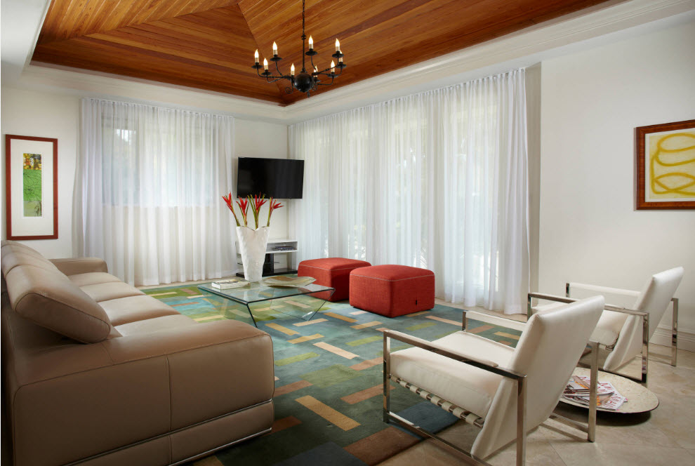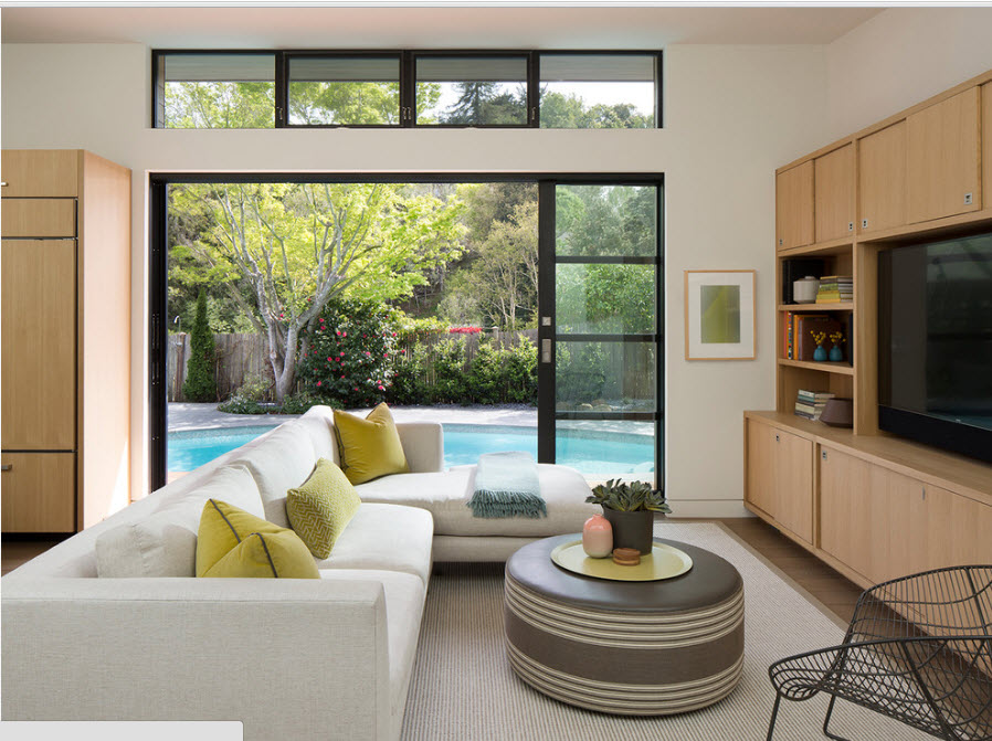 В современном дизайне большое внимание уделяется свету. Наполненное солнечными лучами помещение – чистый лист для воплощения ваших фантазий в сфере оформления своего жилища. Достичь наполненности комнаты естественным освещением возможно только при помощи больших окон. В особенности панорамные окна необходимы, если помещение выходит на северную сторону здания. Необходимость в постоянном естественном освещении подталкивает многих дизайнеров (а вслед за ними и владельцев квартир и домов) не использовать драпировку для окон. Лишенные текстиля оконные проемы органично вписываются в минималистский настрой современной стилистики. Если же ваша комната выходит на южную сторону и без тюля или занавесок на окнах обойтись сложно, то специалисты рекомендуют выбирать универсальную белоснежную вуаль или тканевые жалюзи (римские шторы, японские шторы-экраны) в нейтральных, светлых тонах.