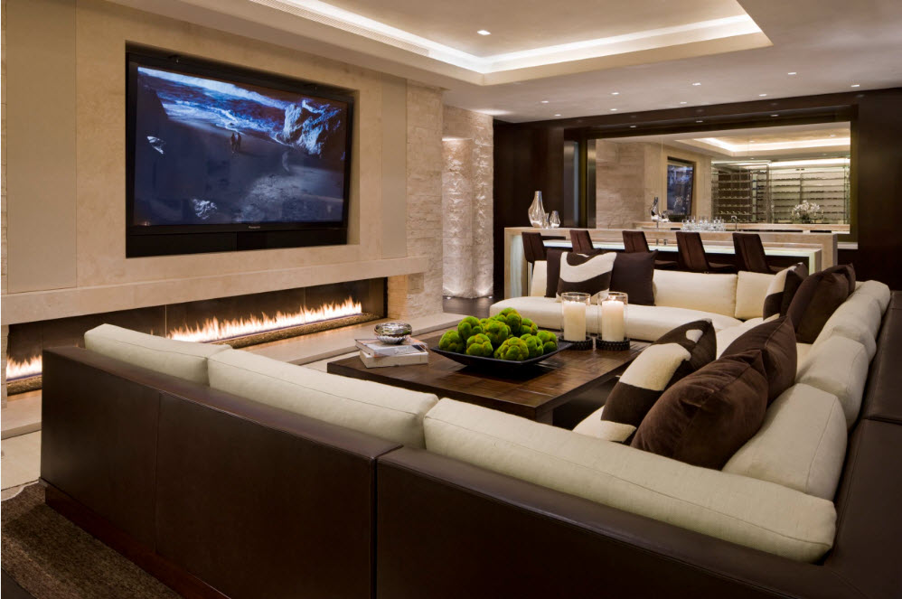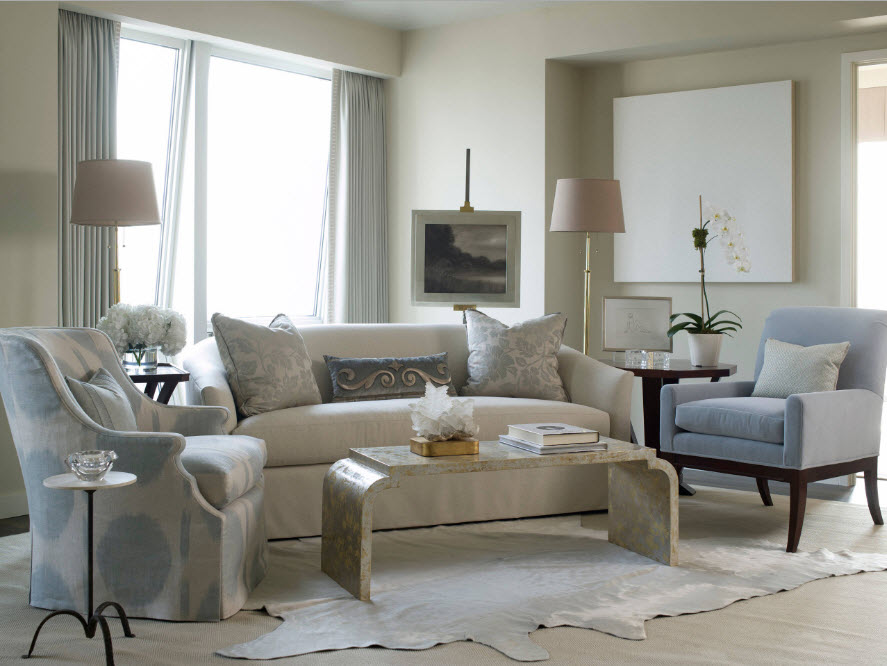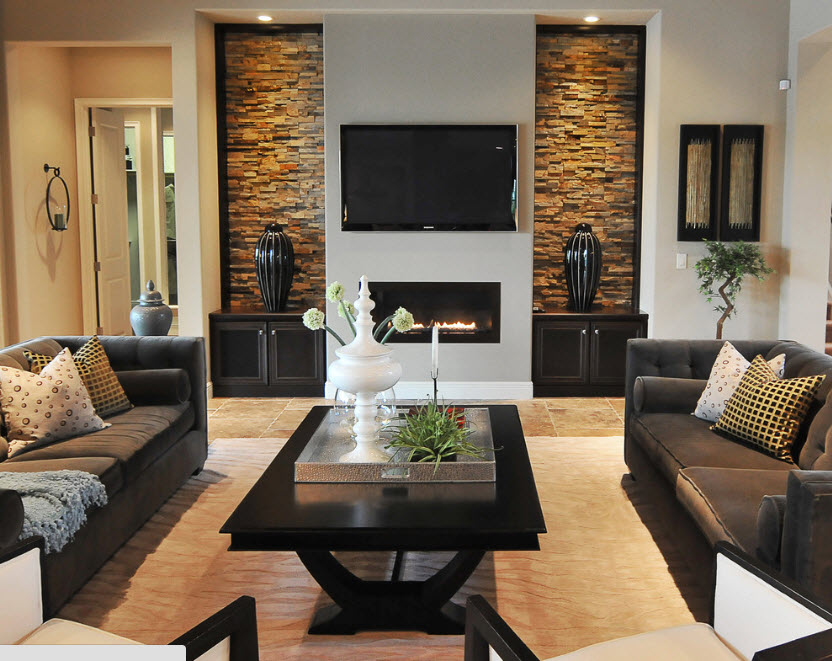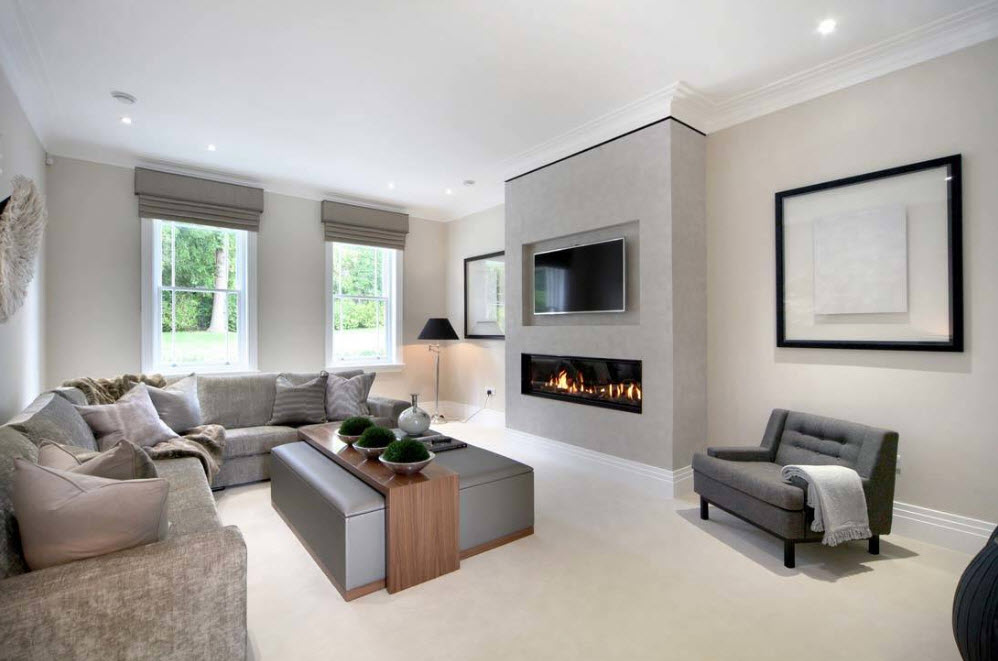 Влияние минимализма на становление современной стилистики сложно переоценить. И все же гостиная, оформленная с учетом современных идей в дизайне интерьеров – это не «голый» минимализм, представленный лишь парой предметов меблировки на фоне светлых стен без картин и фото в рамках, это не лишенные декора диванные подушки в однотонном исполнении. Принцип использования только необходимых и функциональных элементов интерьера сохраняется, но в отличии от минимализма, современная стилистика оставляет место для комфорта, уюта и тепла, которые часто привносятся не самыми необходимыми с точки зрения практицизма вещами.