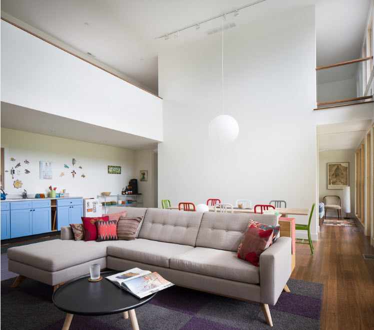 Еще одной эффективной и необходимой вариацией зонирования совмещенного помещения выступает осветительная система. Даже в обычной гостиной недостаточно одной центральной люстры в качестве источника искусственного освещения. А в помещении, которое совмещает функции кухни, столовой, гостиной, а иногда и кабинета, расставить локальные источники света или снабдить зоны подсветкой, просто необходимо. В секторе гостиной можно подвесить люстру или оснастить потолок встроенными светильниками (в зависимости от выбранного дизайна отделки потолка) и установить напольный или настольный торшер для организации уголка для чтения.