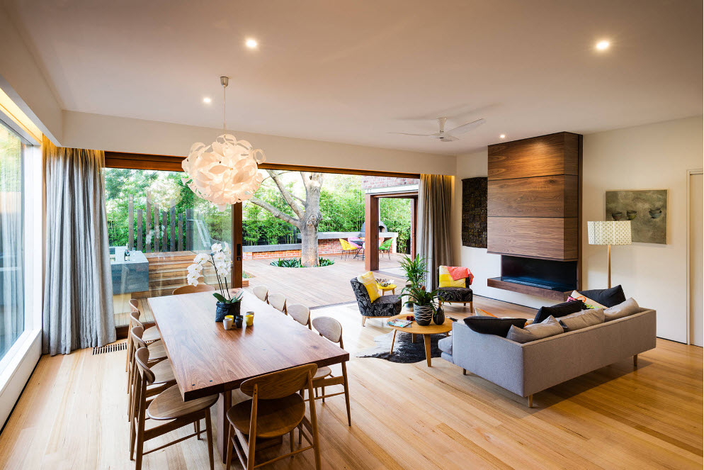 Влияние эко-стиля на формирование современной стилистики проявилось в тяготении к натуральным материалам и создания атмосферы, близкой к природе. Это может прозвучать странно, но большие комнатные растения снова в моде. Если раньше вы не знали, куда поставить большую кадку с зеленой пальмой, то помещение современной гостиной как нельзя лучше подойдет для этих целей. Использование древесины в качестве материала отделки (чаще всего локальной для стен или тотальной в качестве напольного покрытия), сырья для изготовления дополнительной меблировки, такой как системы хранения, кофейные столики или подставки позволяет создать атмосферу, наполненную природным теплом.