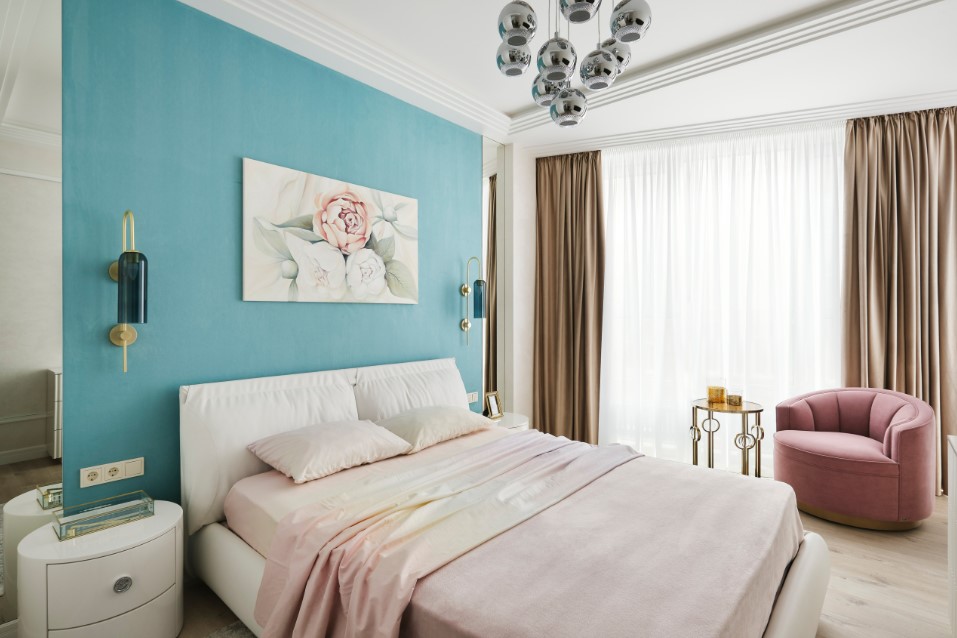 Выбирая оттенки для будущего интерьера женской спальни, следует подчеркивать его женственность, нежность, некий романтизм. Стоит сказать. Что как раз женская спальня может быть оформлена в самых разных, по сути, в любых цветах и оттенках. Женственная палитра очень богата и широка. Подойдут яркие розовые тона, пастельные розовые, пепельно-розовые, молочные, мятные, насыщенные бирюзовые, и даже яркие, такие, как желтые оттенки, оранжевые, др. Вся суть в том, что спокойный фон дает возможность в деталях использовать более яркие и насыщенные цвета, а также очень удачно вписывать все эти оттенки в современные интерьерные стили.
