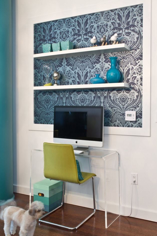 При помощи обоев можно выделять цветом или рисунком пространство внутри ниш, в глубине открытых полок и стеллажей. Также можно оклеить яркими или просто контрастными обоями заднюю стенку шкафа со стеклянными дверцами и не только разнообразить цветовую гамму помещения, но и дать «вторую жизнь» старой систем хранения, фамильной ценности.