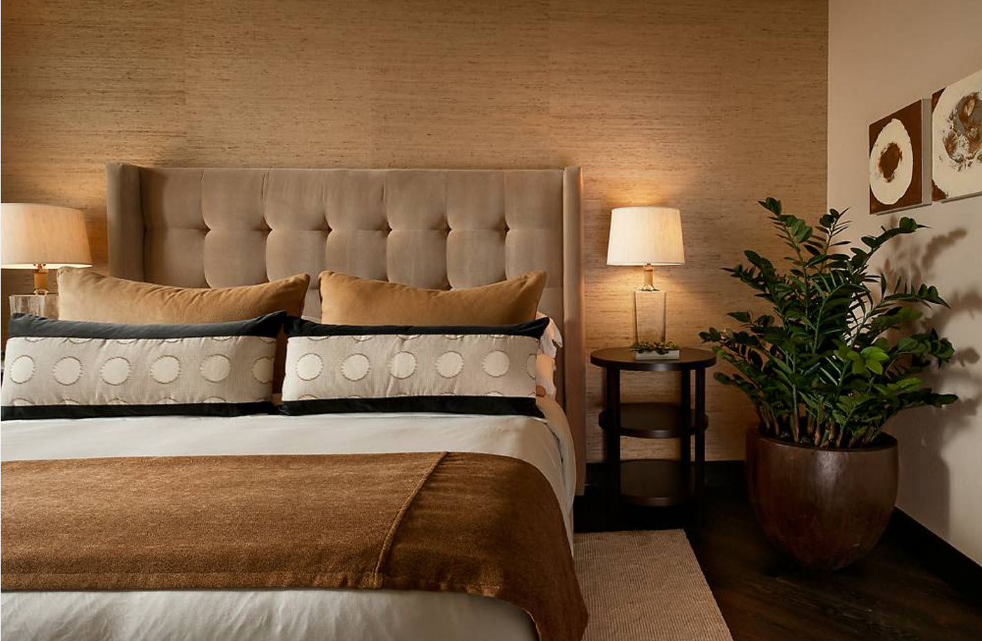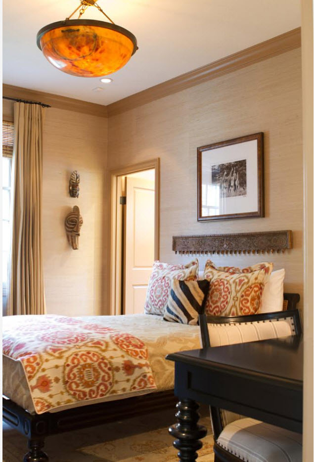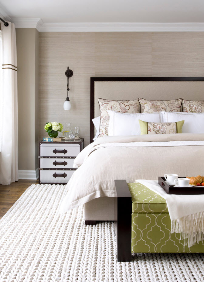Для отделки гостиных и спален часто используются текстильные обои. Высокие экологические качества и роскошный внешний вид компенсируют достаточно высокую стоимость материала. Но существенные недостатки в виде невозможности производить очищение поверхностей стен накладывают определенный запрет на использование текстильных полотен в помещениях с высоким уровнем риска загрязнения. В классических интерьерах чаще всего можно увидеть велюровые, бархатные обои, используемые для создания акцентной поверхности или оклеивания всех стен комнаты. Для создания дизайна в современном стиле больше подходят хлопковые и льняные полотна, которые становятся воплощением «комфортного минимализма».