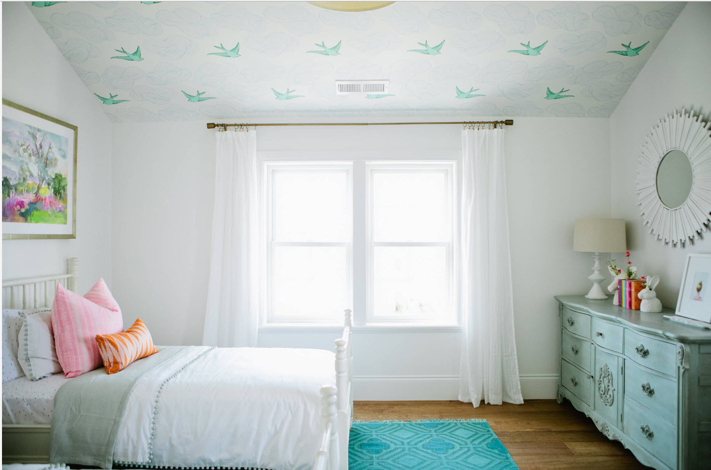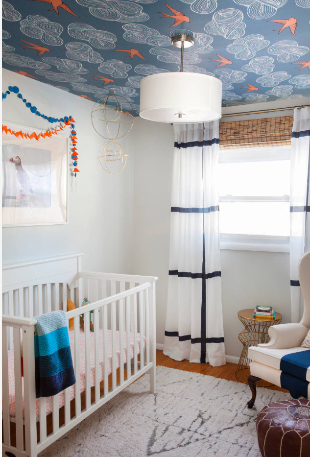 Оклеивание потолка светлыми (почти всегда белоснежными) обоями – давняя традиция российских домовладельцев. Это недорогой и достаточно быстрый способ создания надежной отделки (при условии, что поверхность не имеет изъянов). Но в современных дизайн-проектах специалисты рекомендуют оставить позади стереотипы и позволить себе яркость, контрастность и даже пестроту в оформлении потолка. Но необходимо учесть, что для подобных экспериментов необходимо иметь высоту потолка в комнате выше средней, иначе будет сложно избежать ощущения «давящего» на вас свода.