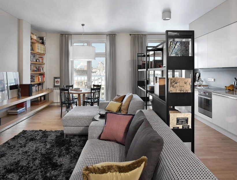 Крупные массивные шкафы или специальные стеллажи следует устанавливать у стен для того, чтобы освободить больше пространства для центра комнаты. Не стоит размещать шкафы и стеллажи у окон: это закрывает естественный свет и делает комнату искусственно затемненной.
