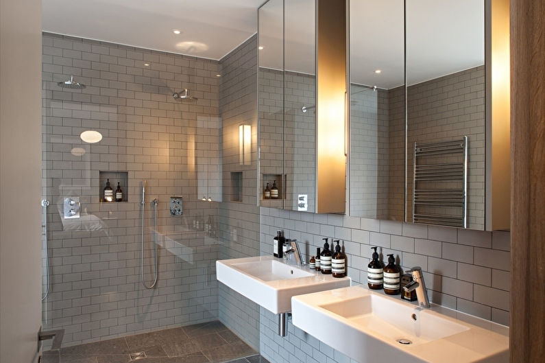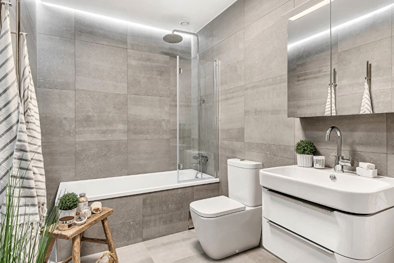 Стиль современной ванной комнаты регулируется принципом «меньше значит больше». Это не означает, что комната должна быть белой от пола до потолка. Данная особенность указывает только на то, что в помещении нет ничего, что непосредственно не наделено функциональностью. Четыре разноцветных полотенца и ряд косметики на виду — это не здесь. Современные ванные комнаты любят монохромные цвета. Помещения в серых и белых расцветках сегодня на пике популярности. Декор не поражает разнообразием и интенсивностью цветов. На климат ванной комнаты влияют интересные сочетания расцветок и материалов. Успокаивающий серый цвет плиток, часто имитирующих бетон, а также белый пол и керамику, которые идеально сочетаются с натуральными оттенками коричневых или бежевых деревянных деталей, прекрасно согревают декор современных комнат личной гигиены.