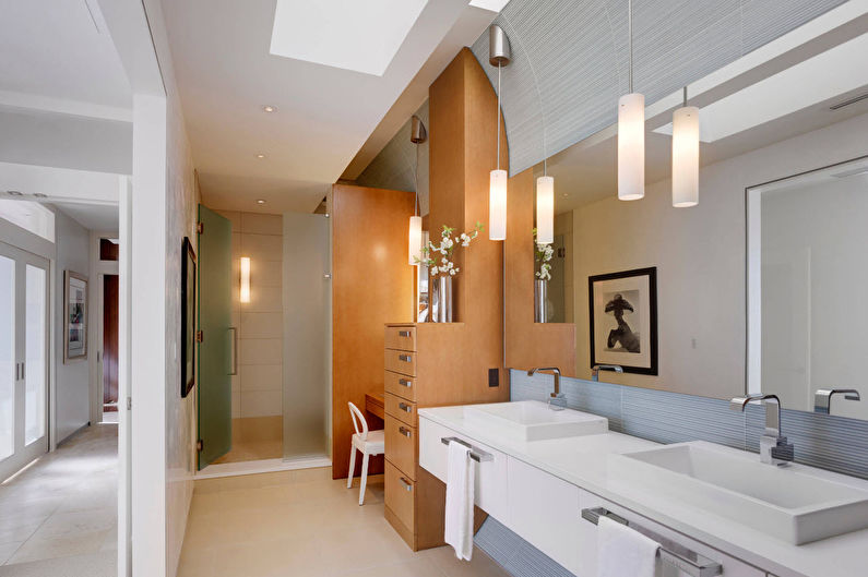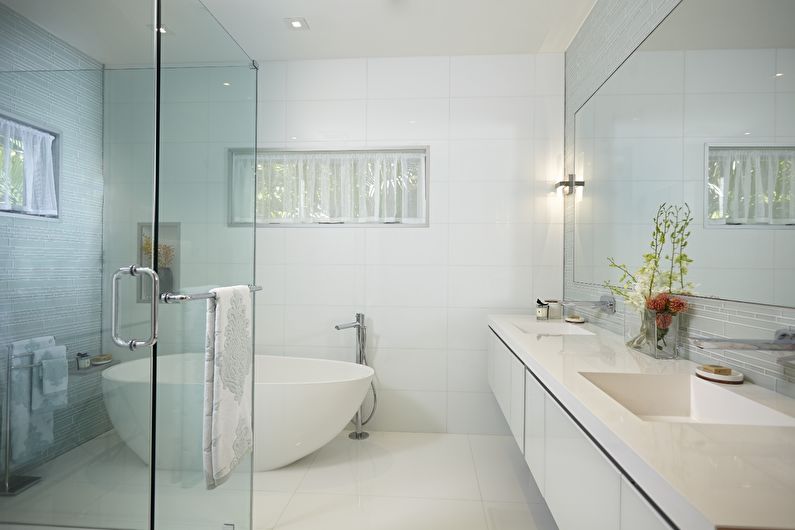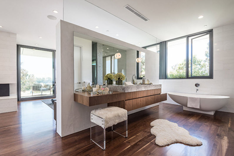 В современной ванной комнате присутствует стилистическое целое, а детали хорошо продуманы. Банные халаты спрятаны в шкафу, косметика в ящике, никаких украшений на плитке, декор только там, где действительно нужен. Это не означает полного аскетизма в оформлении современного интерьера, так как плитка в ванной комнате не обязательно должна быть серой, она может быть лавандовой. Современные ванные комнаты — это тренд для тех, кто ищет покой дома, пространство для созерцания и избавления от постоянной суматохи. Современная ванная комната — это свобода мысли и действий. Здесь вы не найдете лишних полок, которые будут собирать пыль. Даже зеркало кажется единым целым с комнатой. Современный стиль имеет еще одно большое преимущество — он подходит всем. Достаточно изменить цвет полотенец и рамы зеркала, чтобы климат в комнате поменялся.
