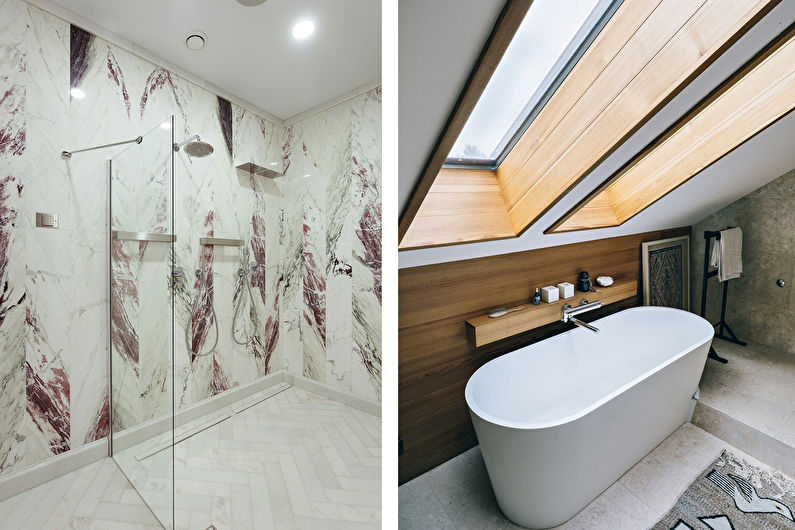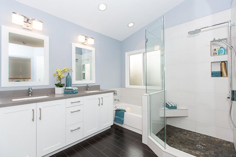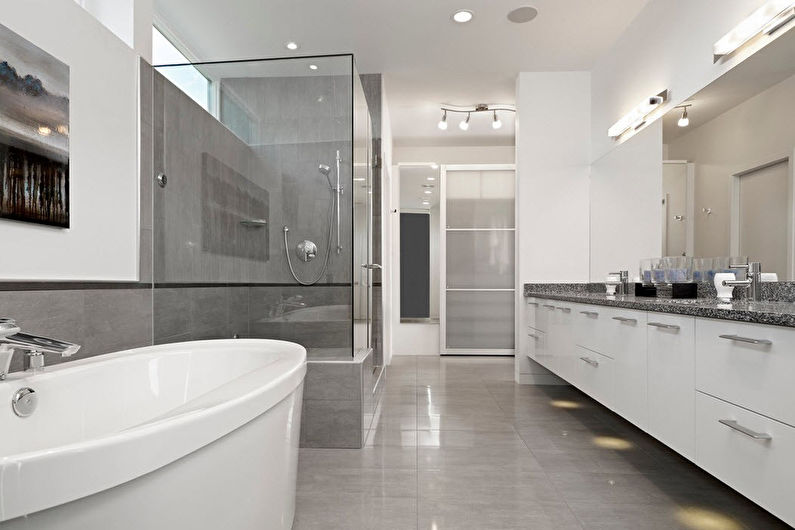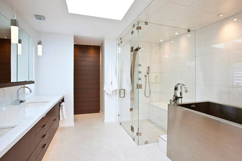 В современной банной зоне душевая кабина отвечает за функциональный аспект пространства, прозрачная стенка которой усиливает впечатление простора и точно вписывается в стиль минималистского дизайна. Можно поставить душ без поддона, оснащенного линейным сливом, установленным на полу или стене. Хорошим вариантом будет выбор плоских поддонов или монтаж на уровне с плиткой, создавая однородную поверхность с полом. Декоративное сохранение направления может относиться не столько к модным каютам, сколько к их отделке. Внутри могут быть представлены интересные решения. Выразительный черный цвет профилей или обогащенный минималистскими акцентами в виде стильных ручек. Ванная комната с душем не означает отказ от ванны. Достаточно того, что любители длинных ванн будут использовать оригинальные ширмы, благодаря которым стильная сантехника будет менять предназначение: сегодня она станет чашей для расслабляющего купания, а завтра превратиться в заряжающий энергией душ после тренировки благодаря освежающему потоку.