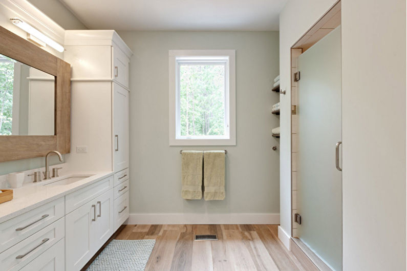 Они обычно встречаются на больших поверхностях стен и полов, создавая впечатление чистоты и естественности. Модной отделкой также является использование цветов, которые по тону похожи друг на друга, создавая монохромный фон для ванной комнаты и, прежде всего, не нарушая аранжировку. Подавляющими фаворитами являются ванные комнаты в белом и в сером цвете.