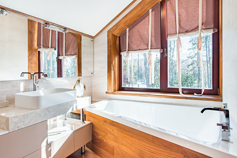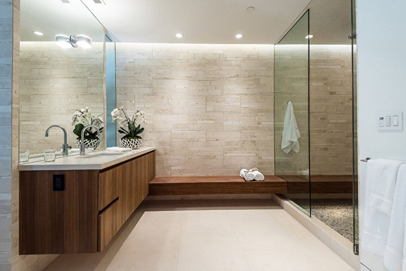 Цвета современной ванной комнаты иногда могут быть определены только материалами, используемыми в расположении. Важно, однако, не переусердствовать с наличием характерного мотива, который не только может доминировать в комнате, но и придать ей другой характер, например, типичный лофт, когда часто употребляется цемент. Любители модернизма используют высококачественную плитку, имитирующую дерево, кирпич, архитектурную штукатурку на стенах, напоминающий камень. В интерьере часто присутствуют металлические акценты и стекло.