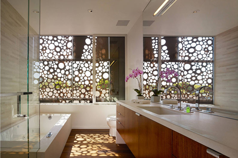 Декоративность современного стиля довольно скудная. Пространство, очищенное от ненужных украшений, выглядит чистым, прозрачным, гармоничным и стильным. Нет места для безделушек, собирающих пыль и необычных коробок. Роль стильных деталей играют зеркала в простых рамах или вровень с линией плитки, которые увеличивают пространство. Чтобы привнести нотку элегантности, дополните ванную комнату элементами из стекла, металла или хрома.
