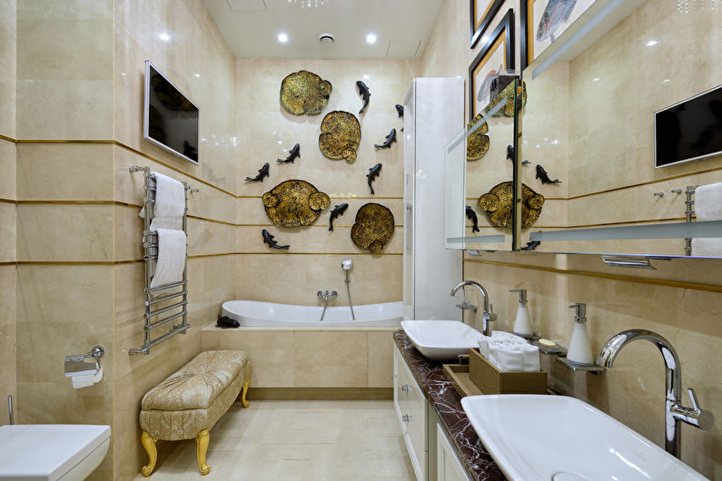 При покупке современной керамики с драгоценными формами ищите простую ванну и плоский поддон. Для классической раковины выберите ванну с аналогичной формой и профилем. Фурнитура также должна соответствовать керамике. Мебель важна для определения стиля. Современные керамические конструкции требуют простых шкафов с гладкой дверцей, покрытой шпоном. Часто стекло, нержавеющая сталь или алюминий становятся главными элементами интерьера.