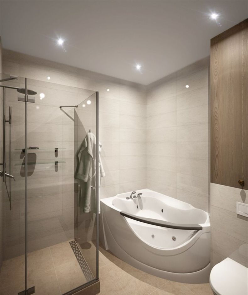 Душ должен обеспечивать безопасность благодаря антискользящей поверхности, а ванна, особенно в небольшой комнате, может быть обогащена ширмой, что дает возможность насладиться прелестями водных процедур, а также освежающим каскадом.