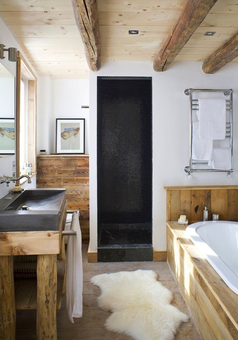 Современная ванная комната в скандинавском стиле является удачным примером комфортного, функционального, дружелюбного интерьера. Пол и стены облицованы деревянными досками, а стены оригинальными плитками с выпуклой текстурой, благодаря которым красиво отражают свет. Они также оптически увеличивают пространство. Прозрачная стеклянная панель, которая отделяет душевую зону без поддона, но с модным линейным стоком, отлично вписывается в дизайн помещения. Внимание обращается на простую черную рамку панели, гармонирующую с подвеской из зеркала с рамкой из металла. Прямоугольный верх, раковина и вместительные деревянные полки гармонируют с интересной нишей в стене для косметики, необходимой при использовании душа. Соответствующее освещение в ванной комнате, усиленное отражением в зеркале, обеспечивает подвесные лампы в стеклянной раме в промышленном, мансардном климате.