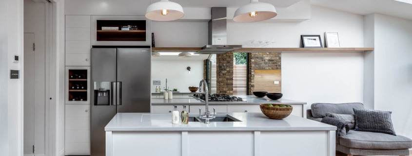 Белоснежные оттенки рабочей кухонной зоны лишь оттеняются серебристым блеском приборов и аксессуаров. Присутствие деревянных элементов – в напольном покрытии и в столовой зоне, придает помещению теплоты характера.