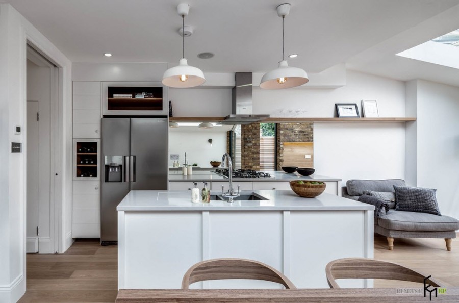 Белоснежные оттенки рабочей кухонной зоны лишь оттеняются серебристым блеском приборов и аксессуаров. Присутствие деревянных элементов – в напольном покрытии и в столовой зоне, придает помещению теплоты характера.