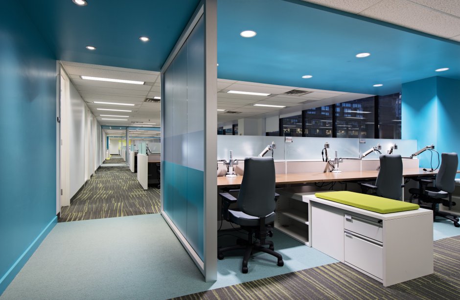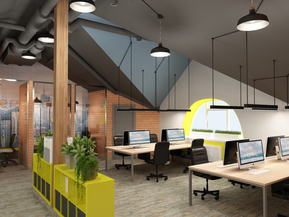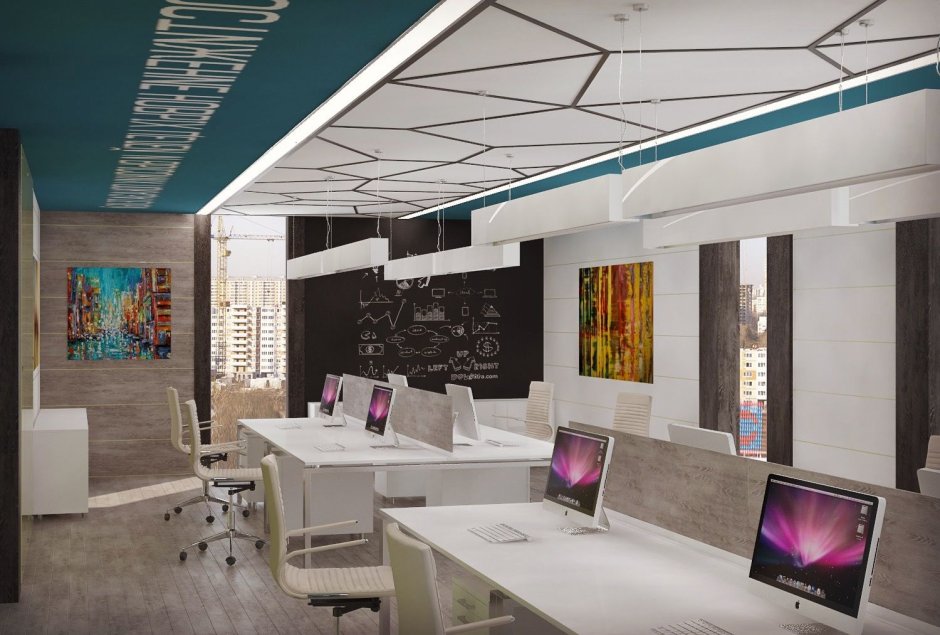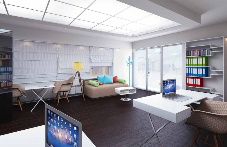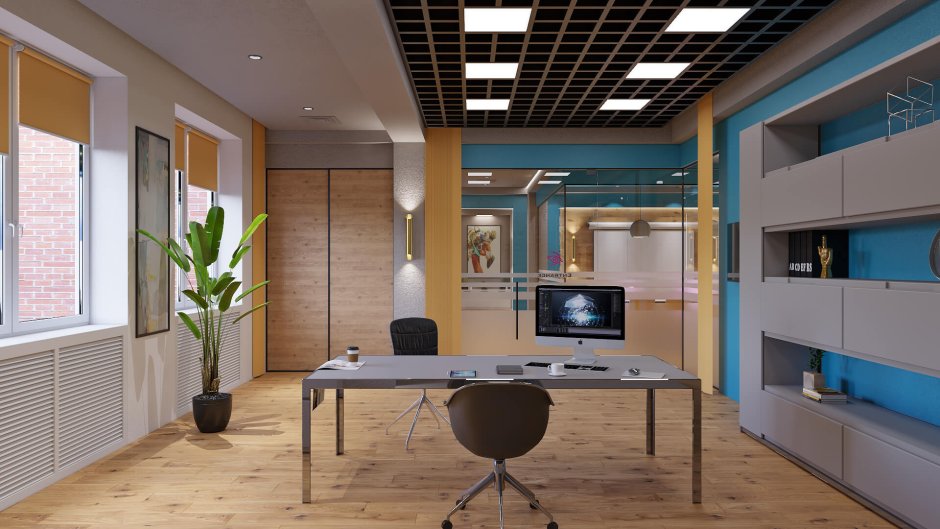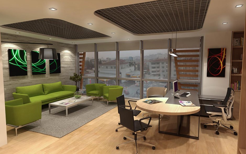 Что касается цветового решения, то здесь следует оформлять офис в цветах компании, в характерные для компании цвета и оттенки. Руководитель при этом может находиться в общем со всеми в зале, но при этом иметь отдельную зону.