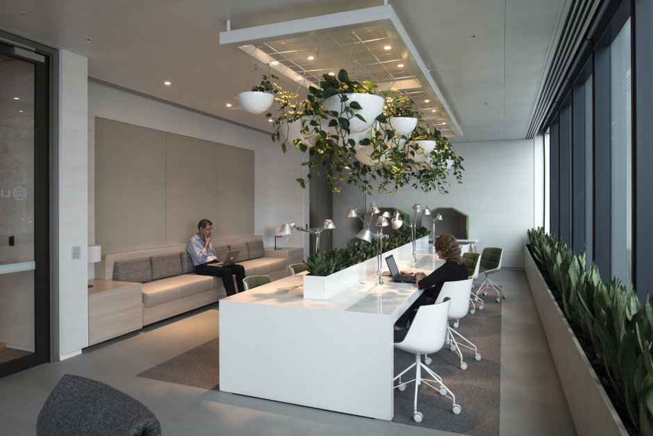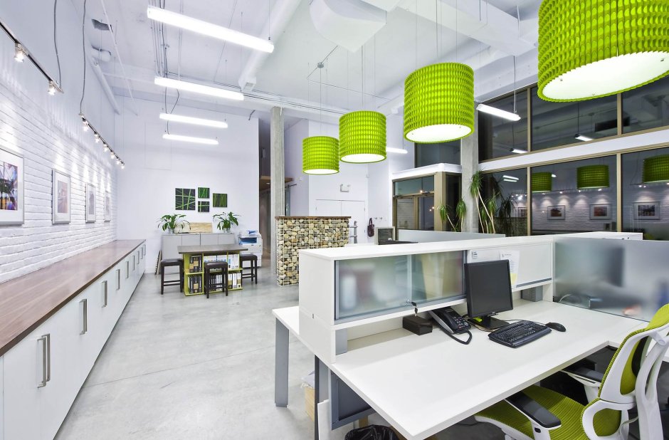 - Много света. Это самый главный принцип любого из офисов. Малое количество света негативно скажется на работоспособности сотрудников. И если говорить об освещении, то она должно быть максимально естественным.